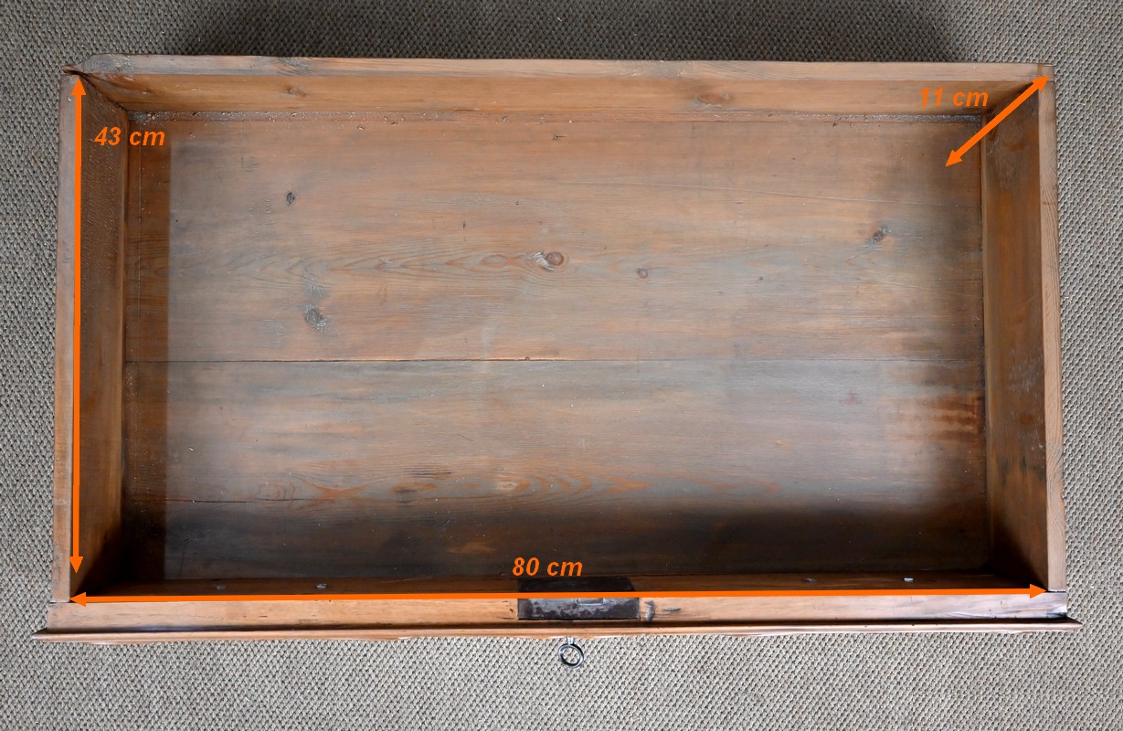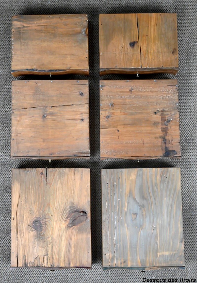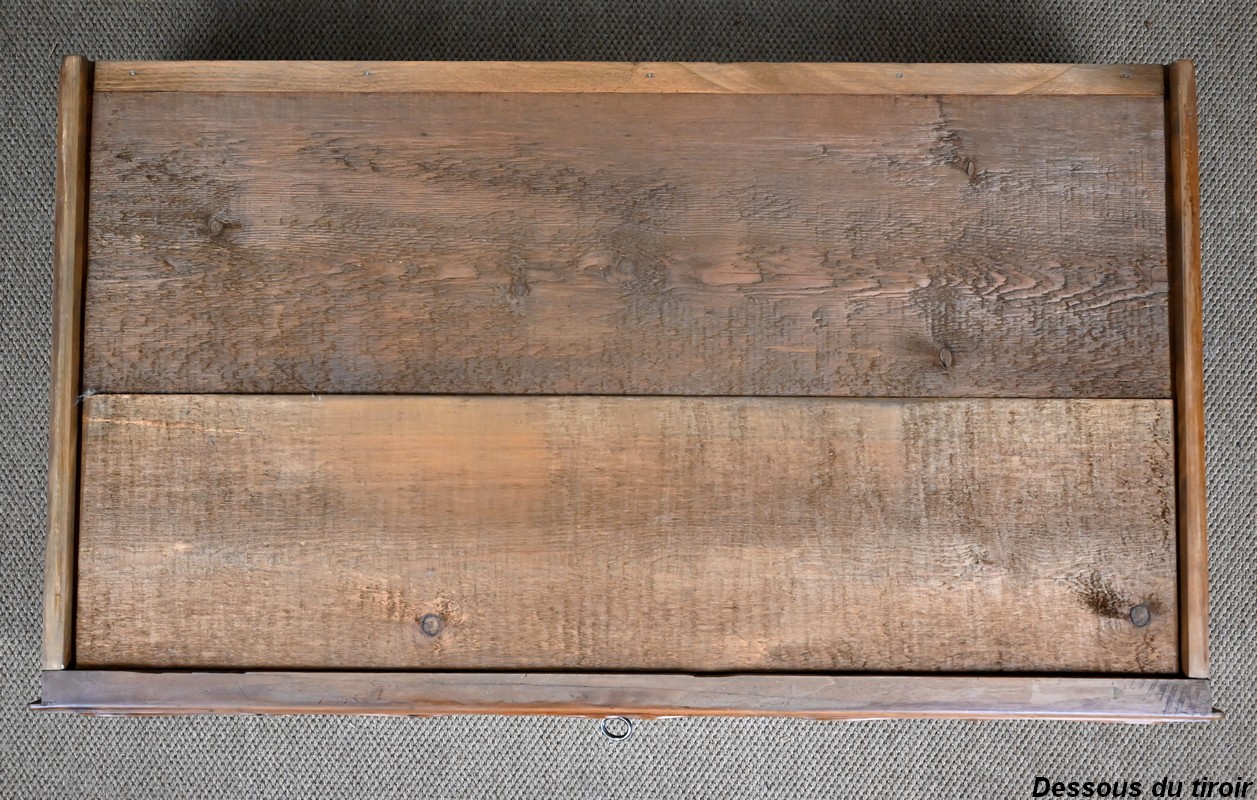 Sous ces derniers s’ouvre un grand tiroir muni d’une serrure d’origine en état de fonctionnement. Tous les trois sont à défoncement, moulurés, et habillés de poignées tombantes en bronze.