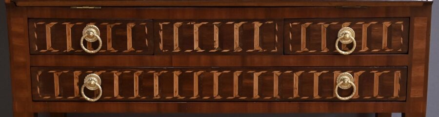 Superbe bureau de pente de style Louis XVI, réalisé au XIXᵉ siècle, en marqueterie de palissandre et d’acajou. Son abattant s’orne d’un délicat décor floral en marqueterie de bois clair et teinté, encadré d’un médaillon ovale en palissandre, lui-même entouré de feuilles d’acajou disposées en ailes de papillon. Cet ensemble raffiné est rehaussé d’un filet marqueté discret, soulignant avec élégance les contours du décor.