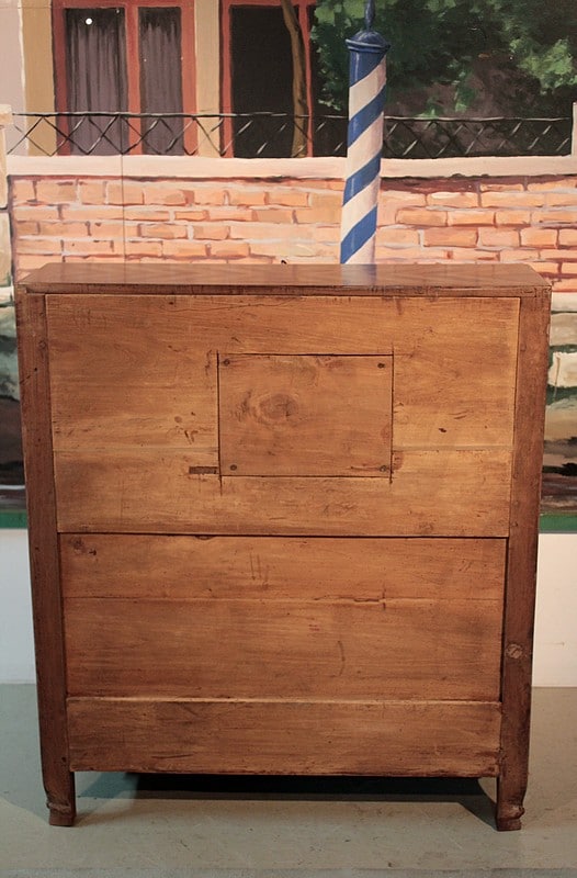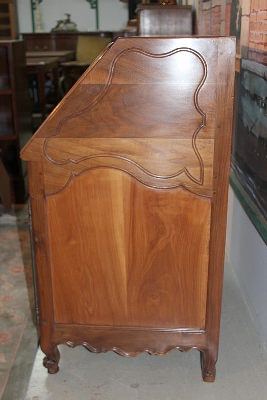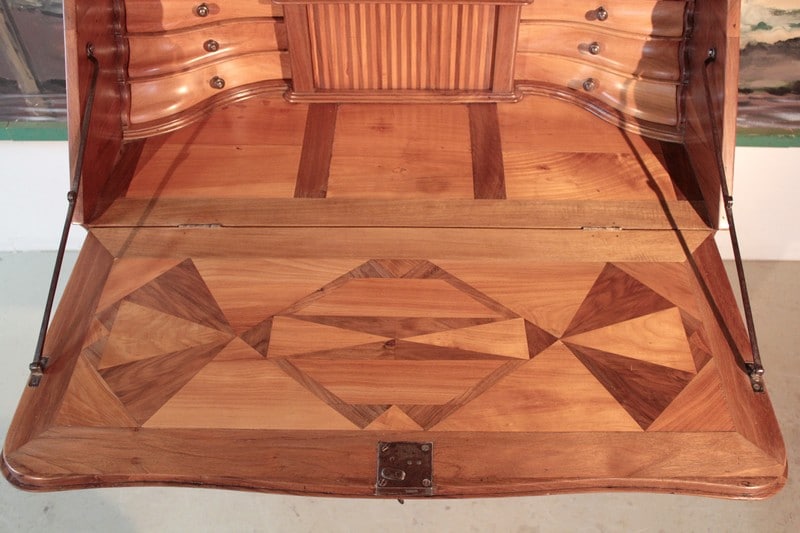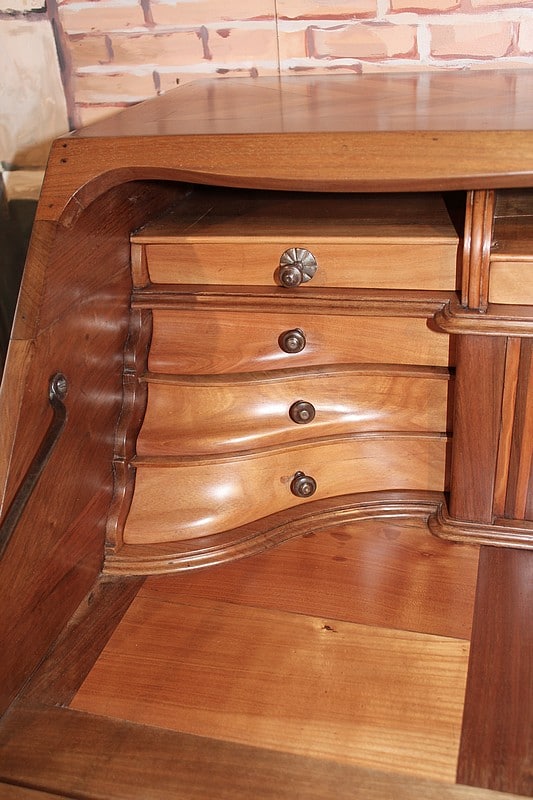 Bureau de pente Louis XV dans l’esprit des meubles de Port, en noyer et merisier marquetés. Il ouvre par un abattant, 2 tiroirs et 2 portes à médaillons. La traverse basse est chantournée et il repose sur des pieds à enroulement. L’abattant, marqueté, découvre 3 tiroirs droits et 6 tiroirs mouvementés en merisier et un rideau coulissant -alternant merisier et noyer- dont l’ouverture peut être bloquée grâce à un mécanisme secret. Sous ce rideau, qui renferme 2 petits tiroirs, une trappe permet l’accès à un casier. L’intérieur du corps bas est garni d’une étagère.