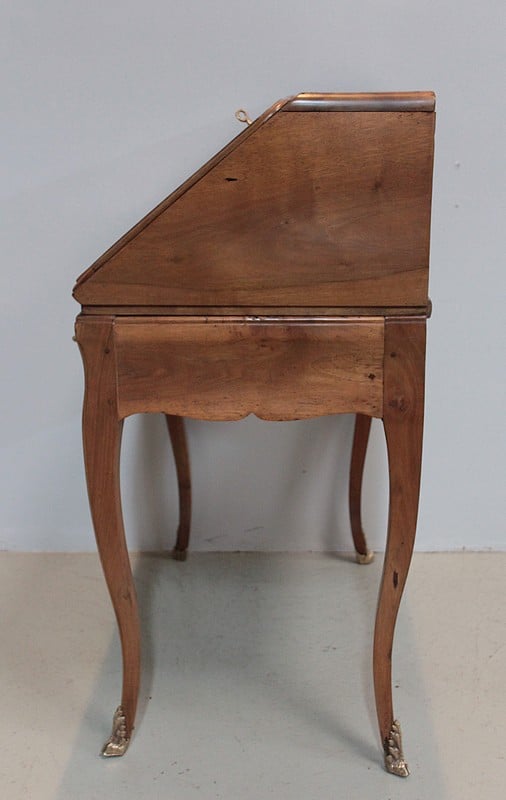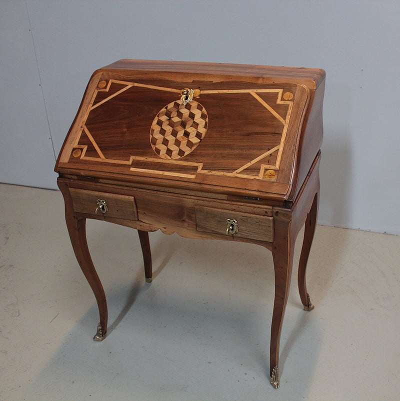 Petit bureau de pente de style Louis XV en noyer blond et marqueterie de buis clair. Ses côtés sont galbés.