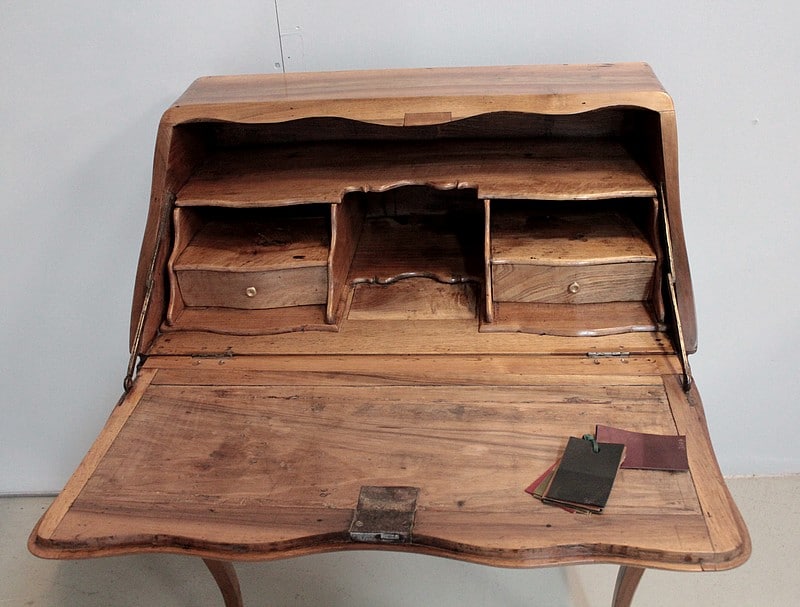 Cet abattant découvre plusieurs casiers, 2 petits tiroirs et une petite trappe coulissante permettant l’accès à un casier secret.