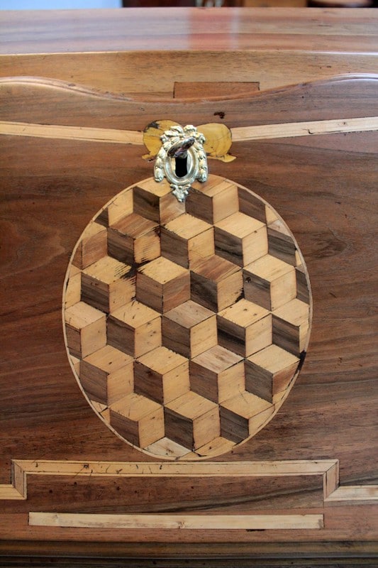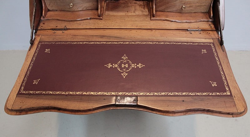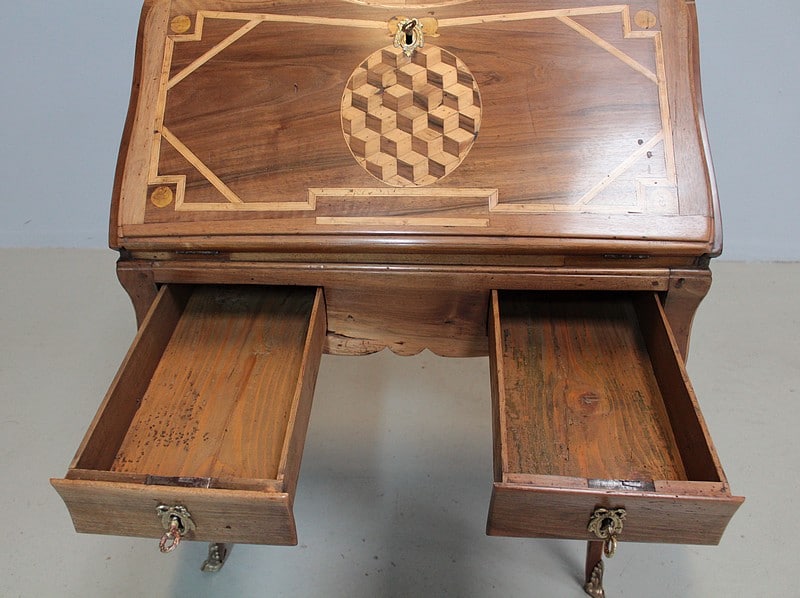 Il ouvre par 2 tiroirs en ceinture et un abattant décoré d’un motif ovale à décor marqueté de cubes et recouvert, à l’intérieur, d’un cuir bordeaux changé.