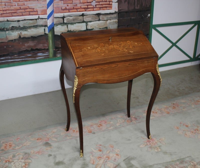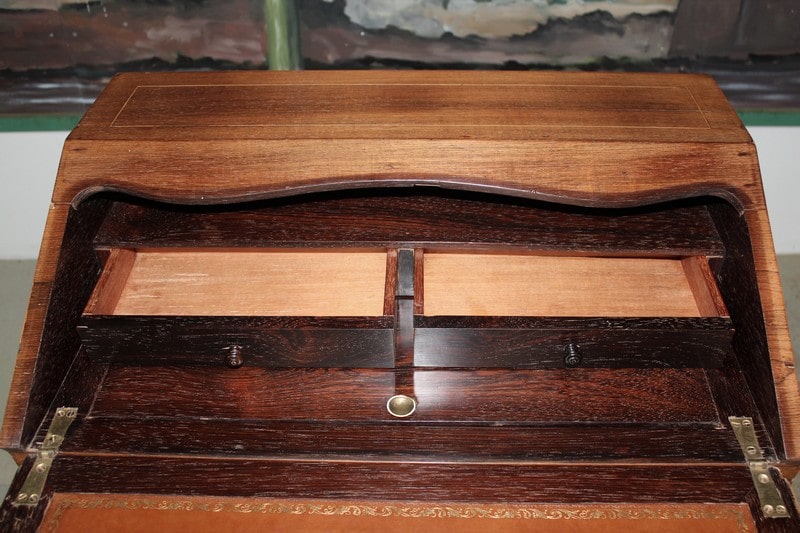 Petit bureau de pente de style Louis XV en palissandre blond avec filets de citronnier reposant sur 4 pieds galbés ornés de bronzes. L’abattant est décoré d’une marqueterie de fleurs , ouvert il découvre un titroir fermant par une planche coulissante et deux petits tiroirs. Son dessus est recouvert d’un cuir marron qui a été changé. Sa hauteur est à 75cm du sol.