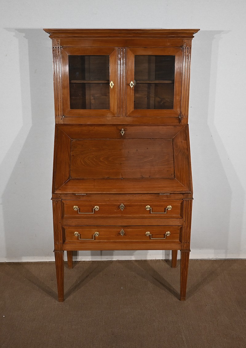 Enfin, ce bureau de pente est sommé de deux portes vitrées à encadrement à coupe d’onglet en merisier, de montants à cannelures et d’une corniche chapeautée.