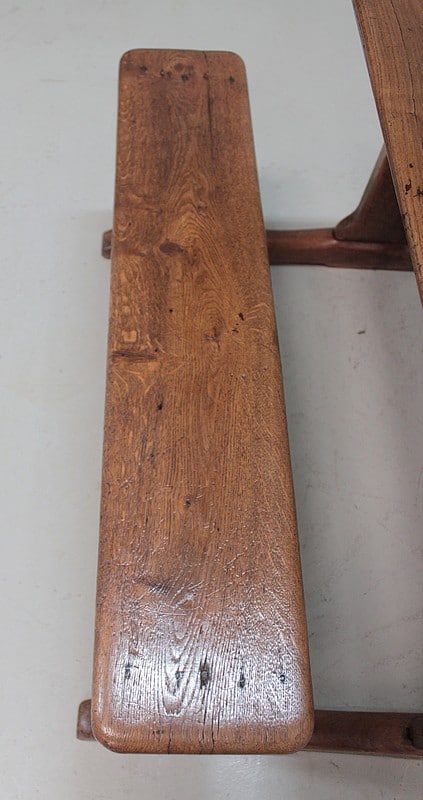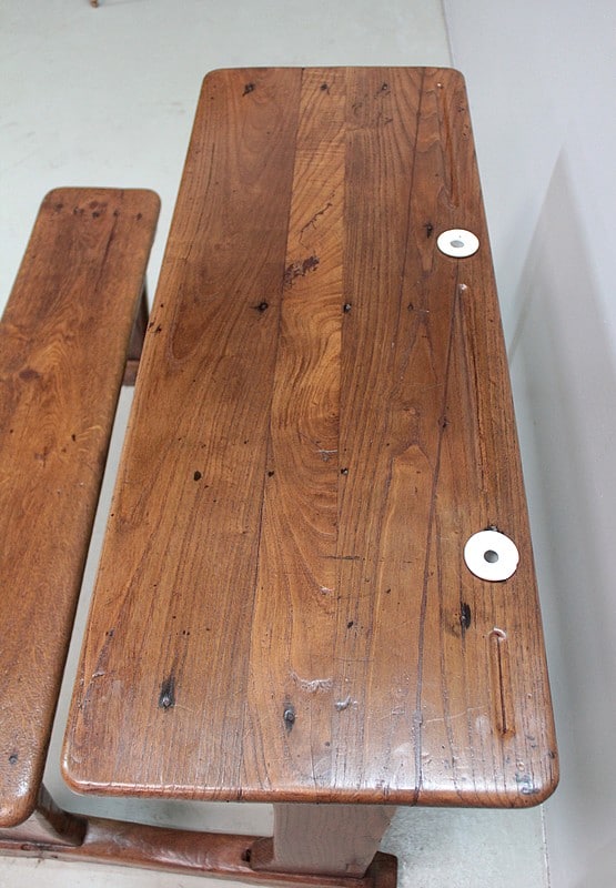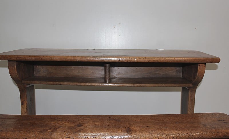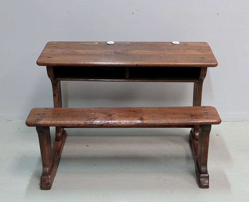 Bureau pupitre double d’écolier en chêne avec son banc.