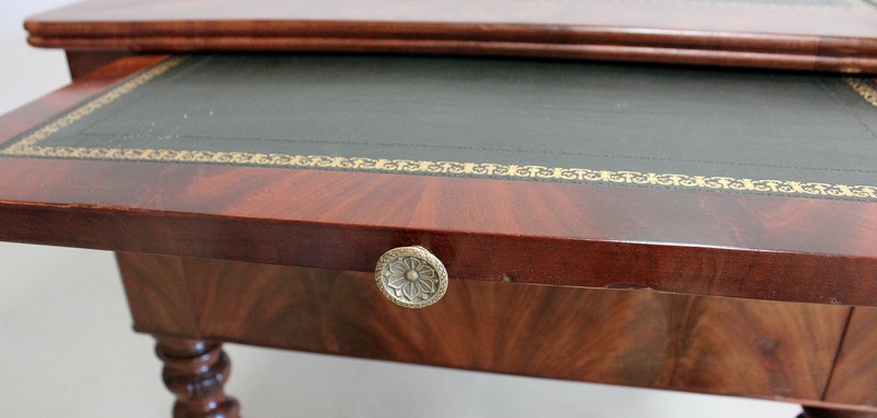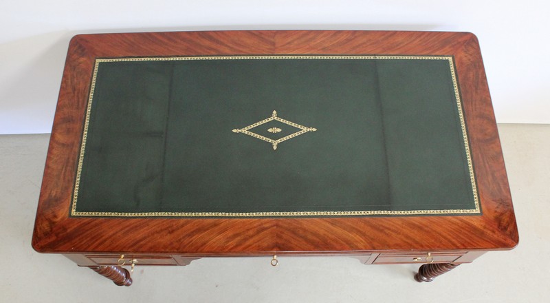 Élégant Bureau Plat de Milieu à Encadrement à Coupes d’onglet, plaqué de Ronce d’Acajou.