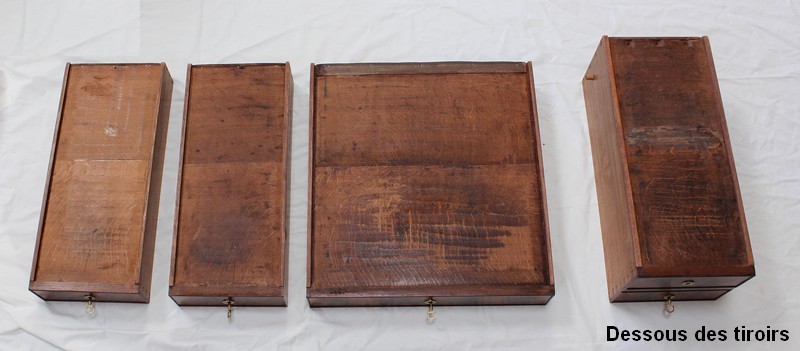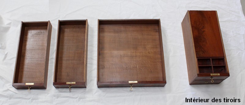 En Façade, on trouve plusieurs Tiroirs soulignés par de petites baguettes, deux tiroirs indépendants à gauche, un plus large au centre, et un double à droite. L’Intérieur de ce dernier est composé d’un casier à monnaie à quatre compartiments. En retirant ce casier, une cache avec couvercle est dévoilée, fermée à clef : le dessus se coulisse une fois ouvert, laissant place à un espace de rangement intéressant.