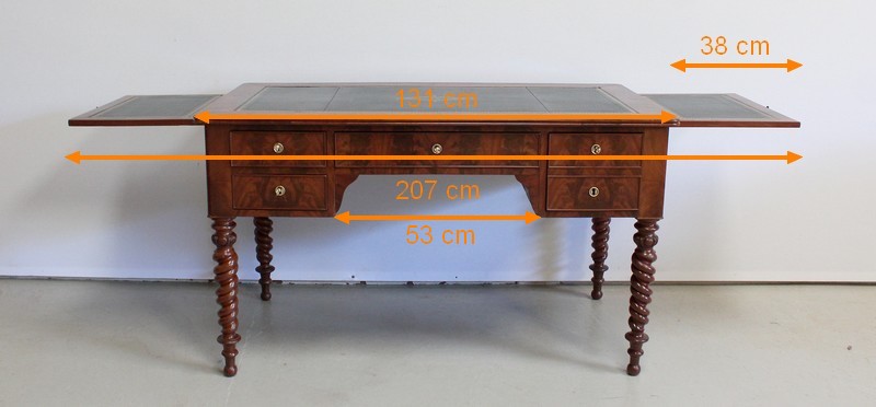 Le Dessus propose un Cuir de couleur Vert Foncé en trois éléments, décoré au centre d’un Motif doré, ainsi que de Vignettes Dorées et de Vignettes à Froid dans son Pourtour. Ce Cuir est encadré par un placage symétrique de Ronce d’Acajou, dont la Bordure est à double Moulure.