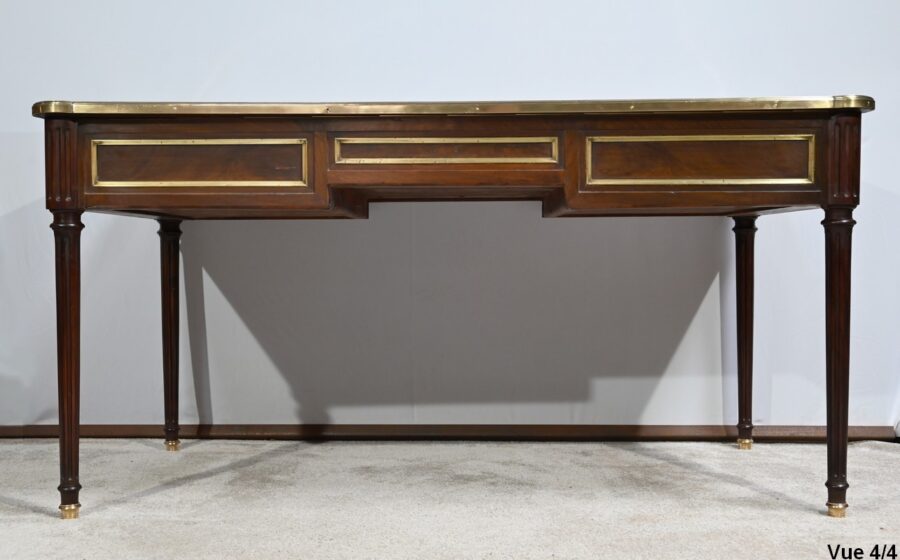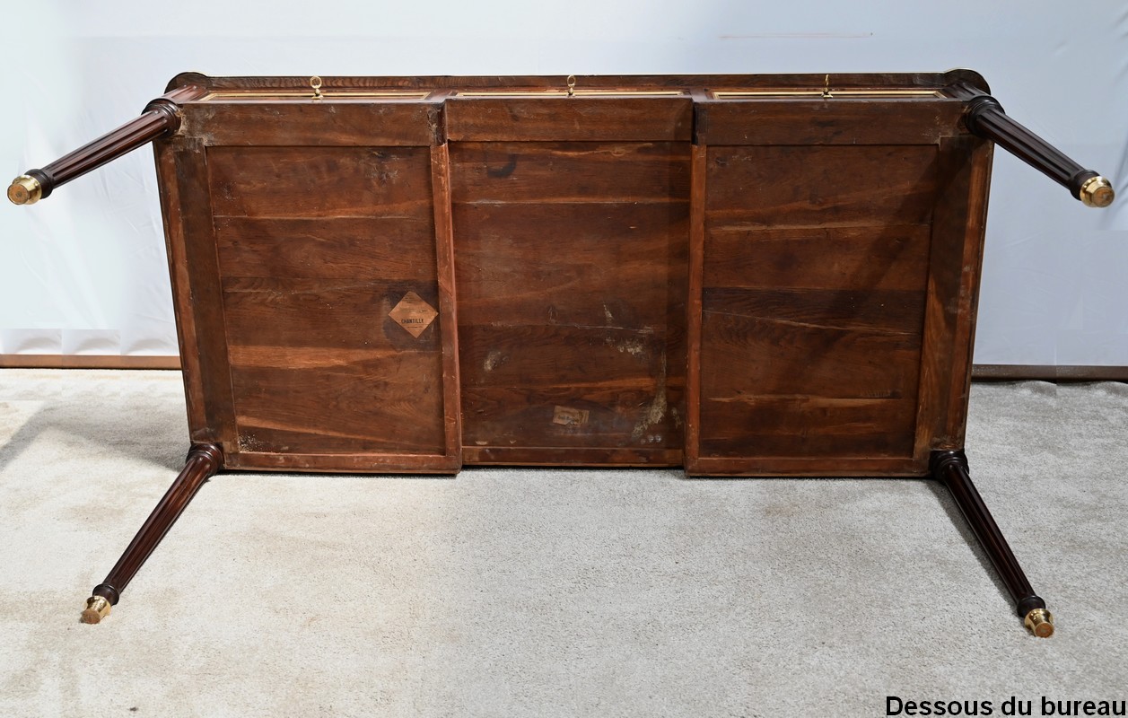 Ce bureau plat de milieu, en acajou massif et plaqué, ouvre par deux tiroirs latéraux de mêmes dimensions et un central moins haut dû au léger décrochement du passage de jambes.