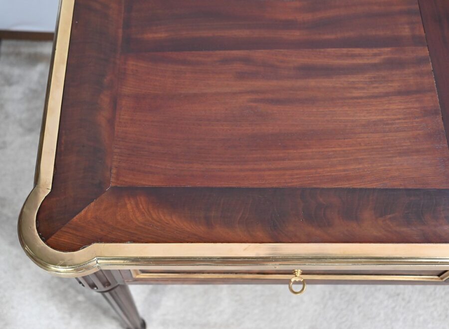 Le plateau est composé d’un cadre à coupe d’onglet, de deux traverses et trois panneaux identiques. Son pourtour est habillé d’un élément en laiton, recouvrant le chant et le dessus, comportant sur l’arête un quart de rond avec deux carrés fins.