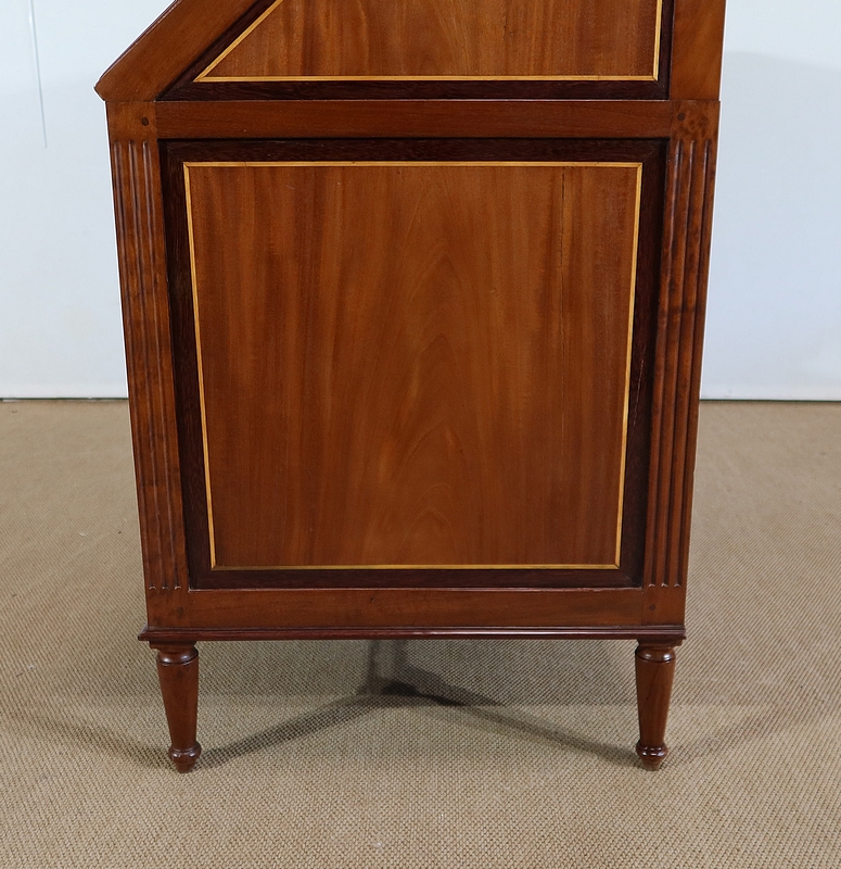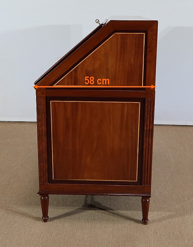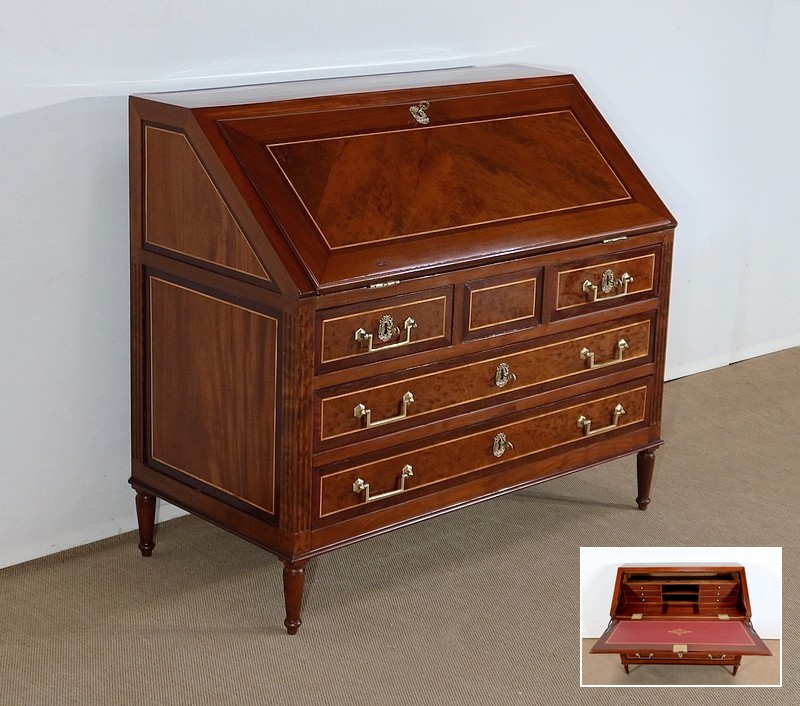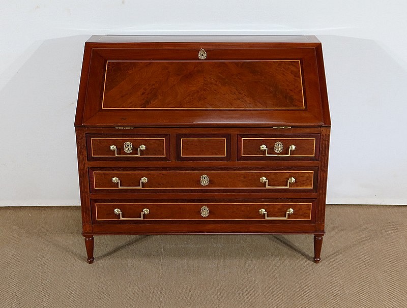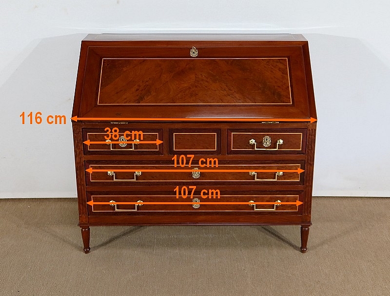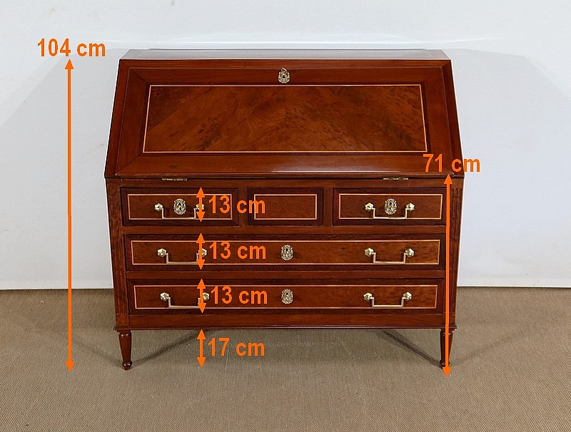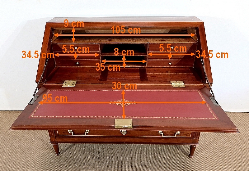 L’ouverture de l’abattant se fait sur d’importantes charnières en laiton. Celui-ci est maintenu dans sa position horizontale par deux compas en fer d’origine dit à genoux. La partie intérieure est recouverte d’un cuir de mouton de couleur lie de vin avec vignette à froid, vignette dorée et motif central. Ce cuir est neuf. La partie intérieure est en acajou massif avec au centre une glissière accédant à une cache secrète. La partie du fond est sur une ossature en chêne. Au centre deux niches sont entourées de chaque côté de 3 tiroirs de même dimensions dont les façades sont en acajou massif et les boutons lentilles sont en laiton d’origine. Les côtés et les fonds de tiroirs, assemblés à queues d’aronde, sont en chêne. A noter que les caches poussière entre les tiroirs sont sur toute la profondeur du meuble.