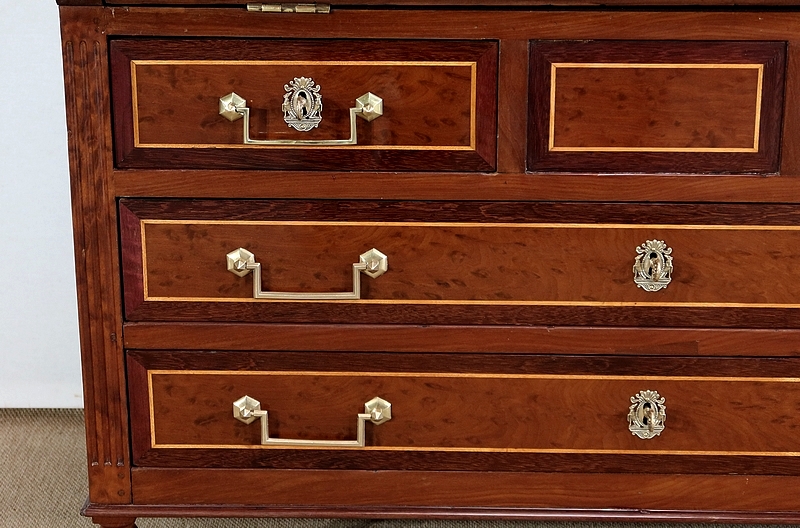 Superbe Commode Scriban de travail nantais, réalisée dans les règles de l’art au XVIIIe siècle durant le règne de Louis XVI. Ce mobilier de haute qualité se constitue de placage d’acajou, d’amarante, de citronnier et de buis.