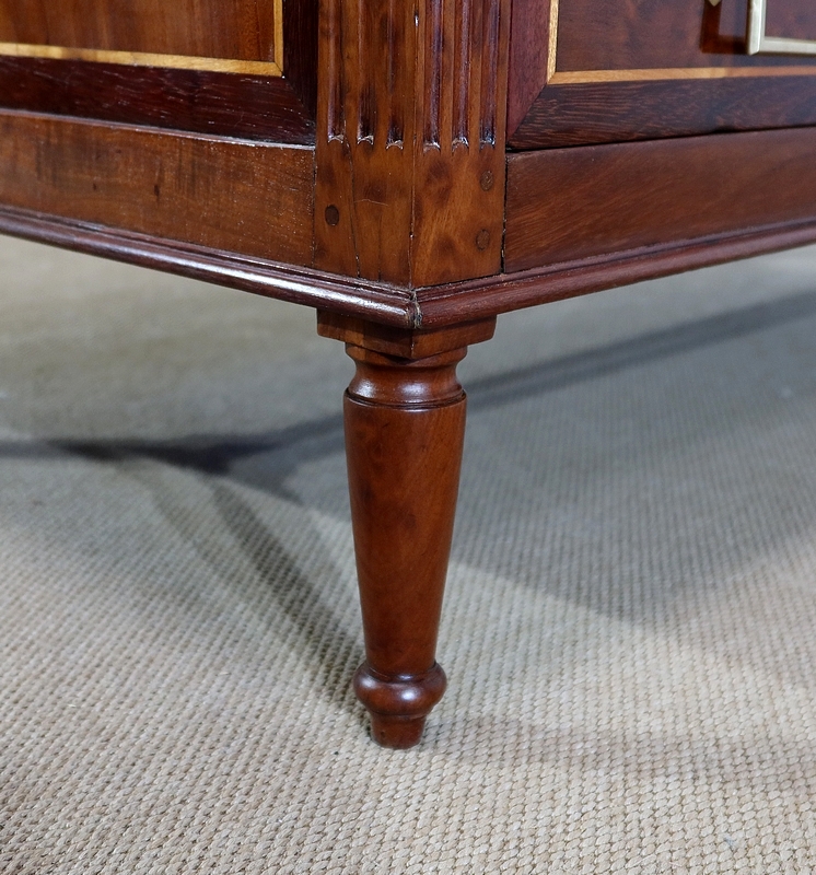 De chaque côté de ce meuble prestigieux nous découvrons des montants à base carrée comportant 3 cannelures arrêtées et soulignée par une fine moulure. L’ensemble repose sur 4 pieds tournés épurés.