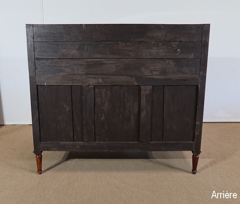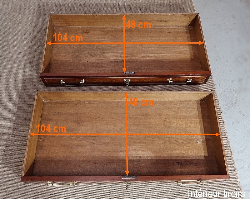 En partie basse nous observons deux larges tiroirs identiques sur toute la longueur, surplombés de deux tiroirs plus petits. Leurs façades sont dotées d’un magnifique et rare acajou moiré, entouré d’un filet de citronnier encadré d’une bande d’amarante à coupe d’onglet dans les angles. Au centre de chaque tiroir, nous retrouvons une entrée en bronze finement sculptée représentant des animaux, des arabesques et une guirlande perlée. Les serrures d’origine en état de fonctionnement sont accompagnées de leur clé ciselée. Des poignées de tirages Louis XVI en laiton finissent d’orner ces tiroirs.