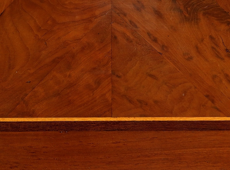 Cette Commode Scriban présente en partie haute un bel abattant dont le centre en acajou moirée est formé en aile de papillon. Autour, un filet de buis puis une bande d’amarante possèdent un entourage en acajou de fil avec coupe d’onglet. Le dessus est composé d’un placage identique, ainsi que les côtés dotés quant à eux de deux panneaux.
