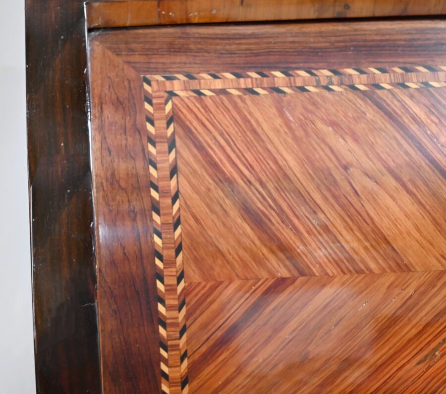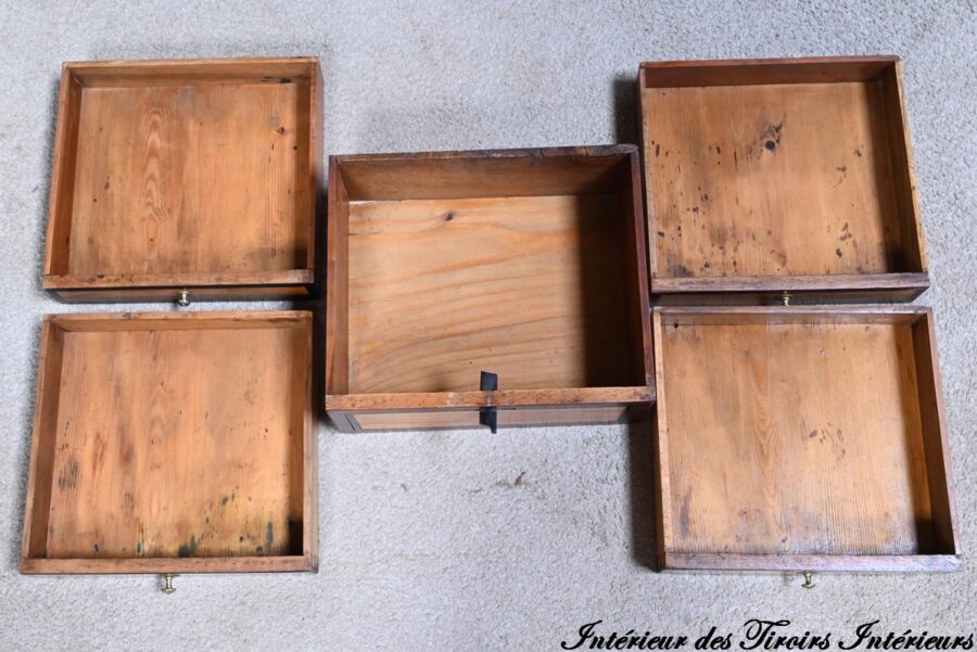 L’intérieur offre une tablette coulissante avec bouton bronze. La bordure de celle-ci est en bois de rose à encadrement à coupe d’onglet en bois clair.