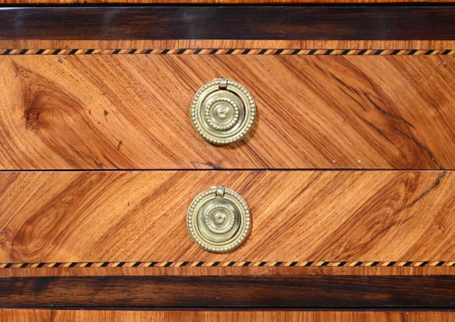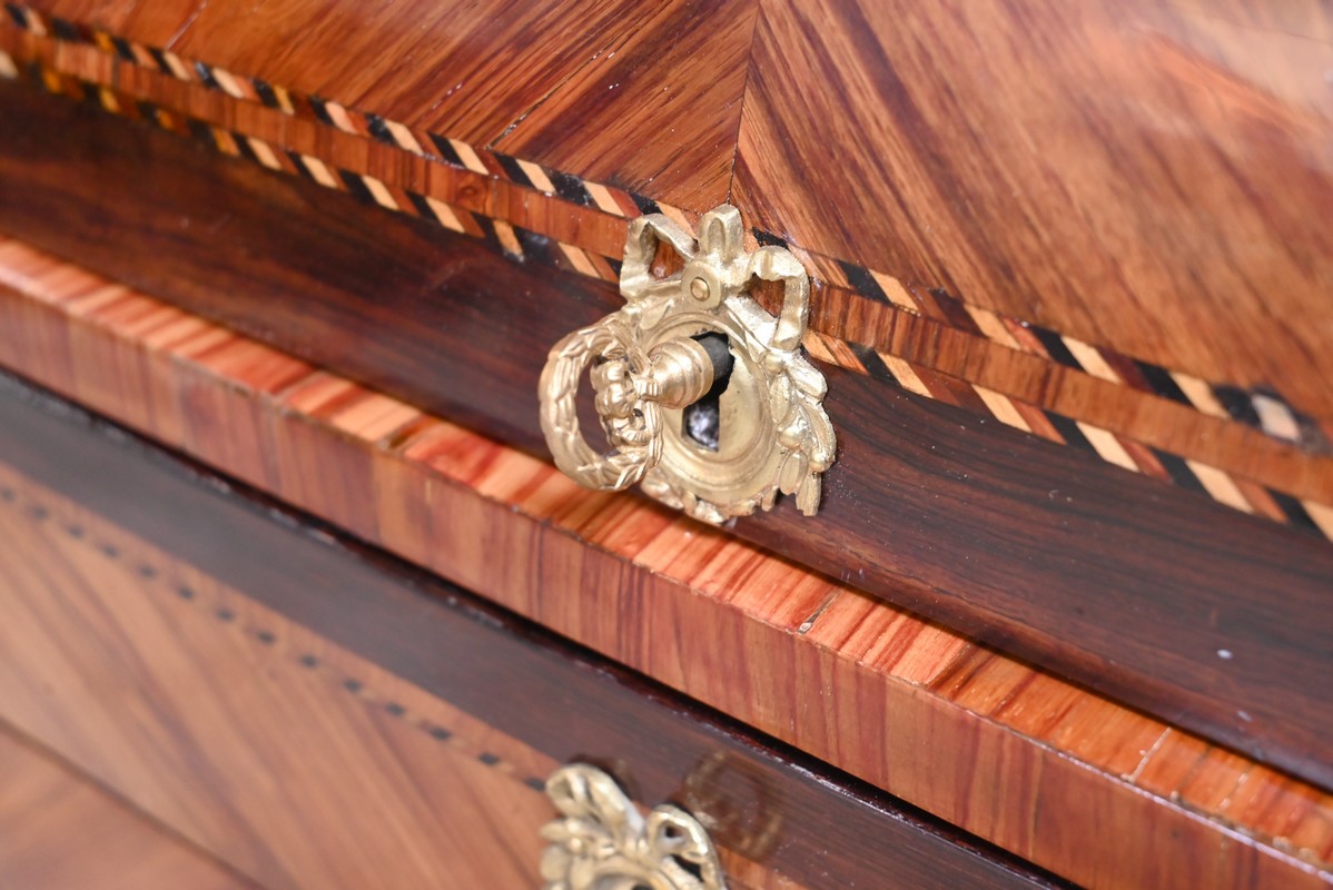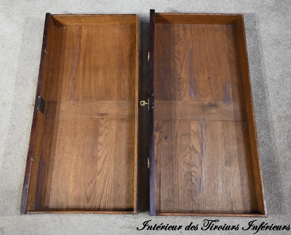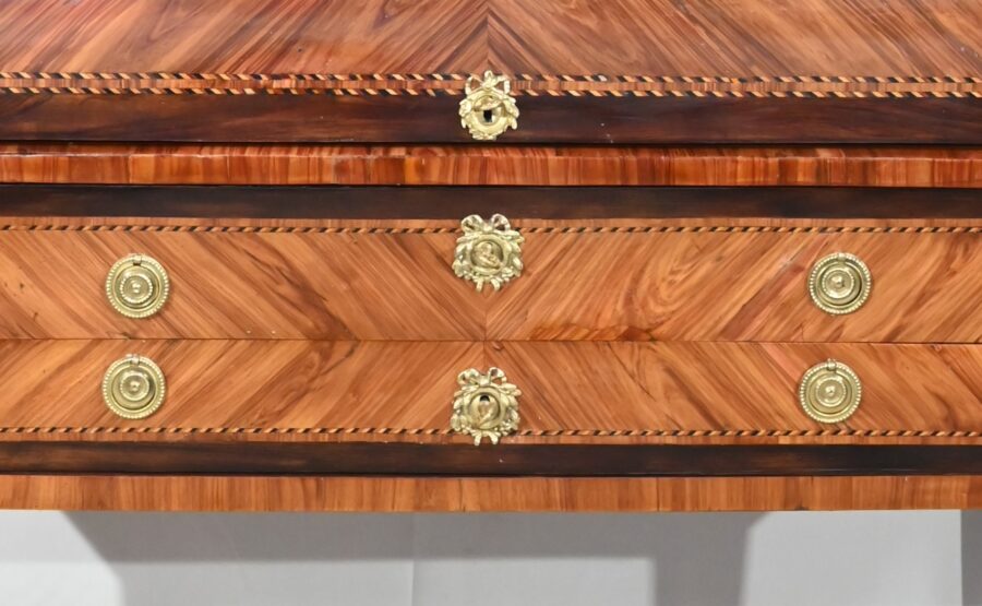 En dessous, ce bureau comporte en façade deux tiroirs, à traverse cachée, avec façades en bois de rose, plaquées en ailes de papillon, agrémentées de filets. Ces tiroirs à poignées anneaux perlés avec mascarons présentent des serrures authentiques avec entrées Louis XVI et leurs clés postérieures ajustées.