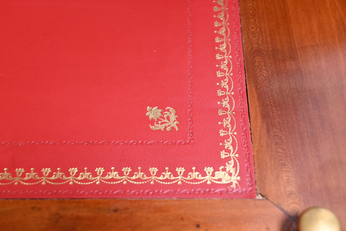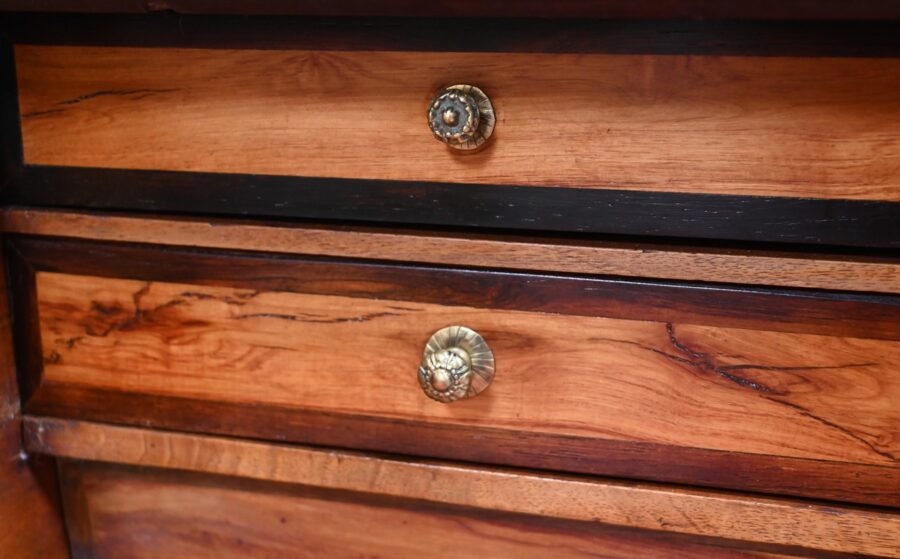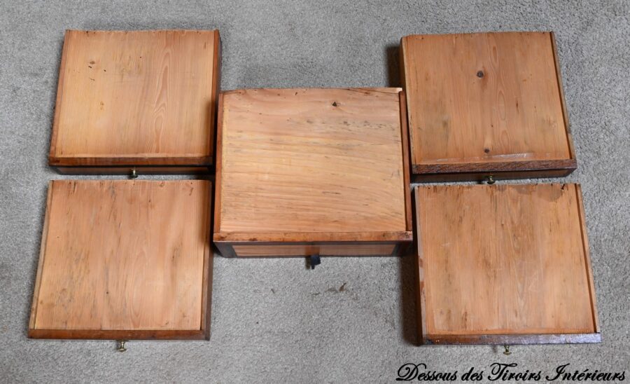 Cet espace de travail comprend, de chaque côté, deux tiroirs munis de boutons festonnés en bronze, à façade en bois de rose entouré de bois de violette, et au centre un tiroir secret avec système de fermeture cachée sous le tiroir supérieur droite.