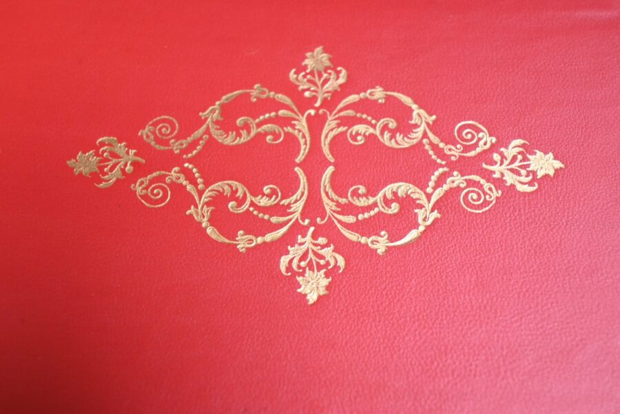 Cette tablette est foncée d’un cuir rouge avec vignettes à froid, vignette dorée, motifs d’angle et motif central.