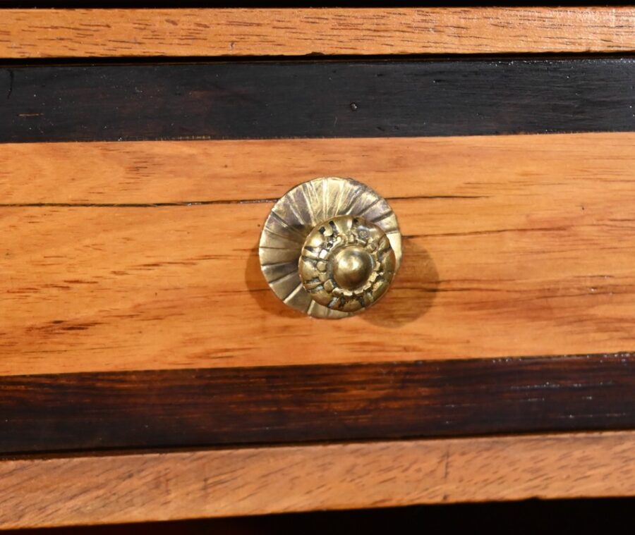 Les côtés de ce meuble sont ouvragés à l’identique avec les mêmes essences de bois.