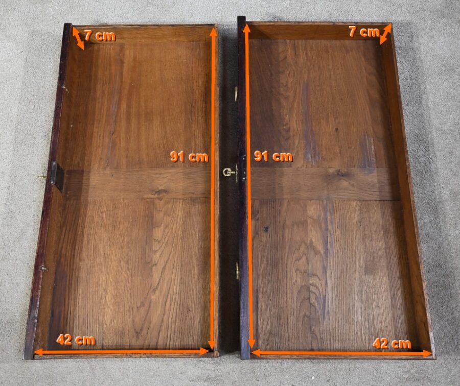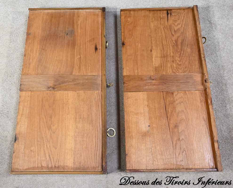 Ces portes, montées sur charnières laiton et équipées d’une serrure d’origine fonctionnelle avec entrées Louis XVI et clé ajustée, donnent accès à trois étagères sur crémaillères.