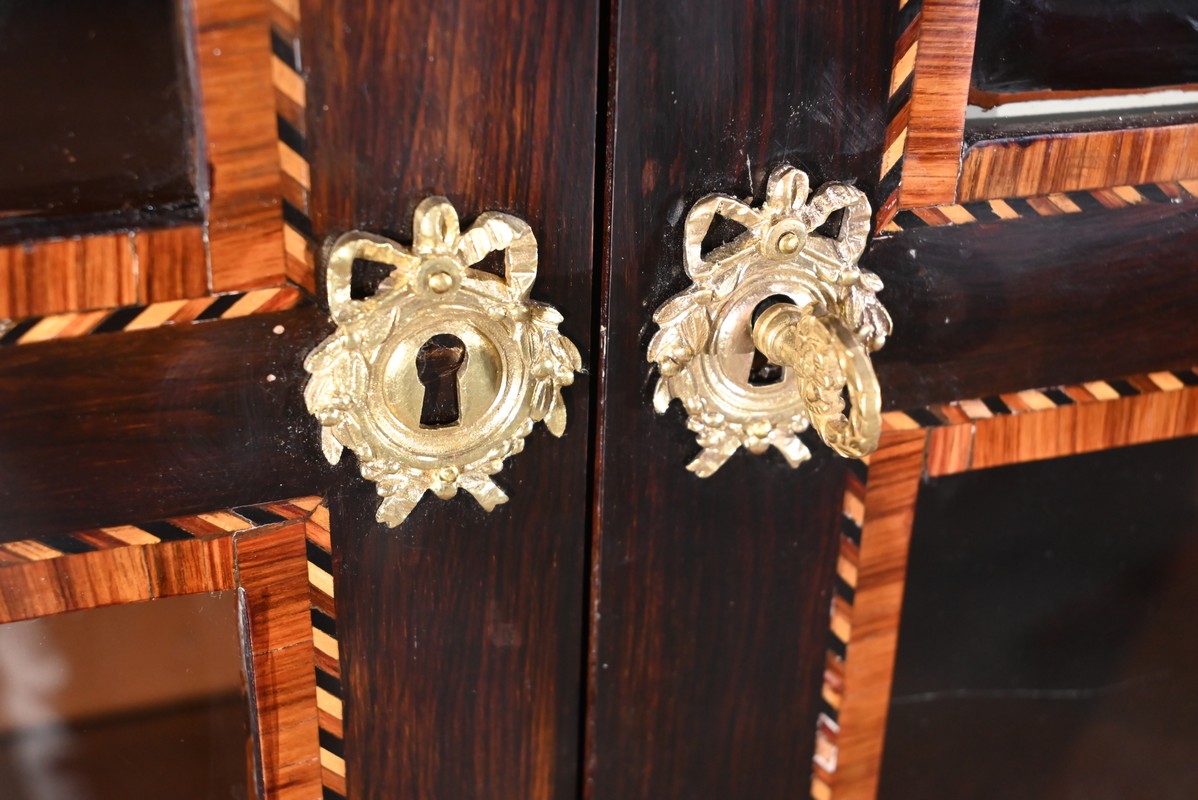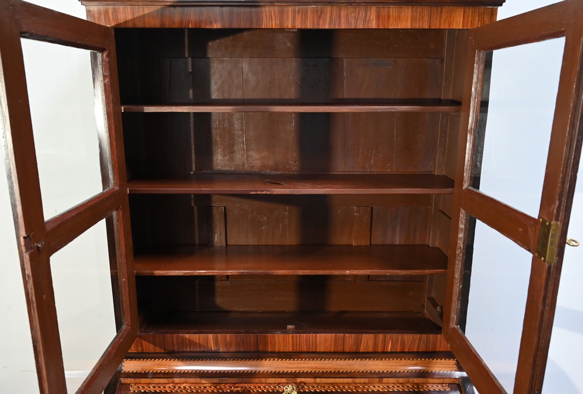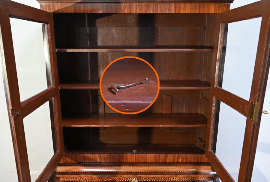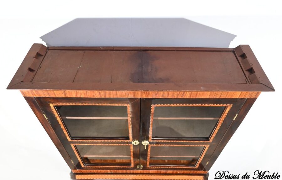 La partie supérieure est quant à elle composée de deux portes vitrées encadrées de bois de rose et de filets.