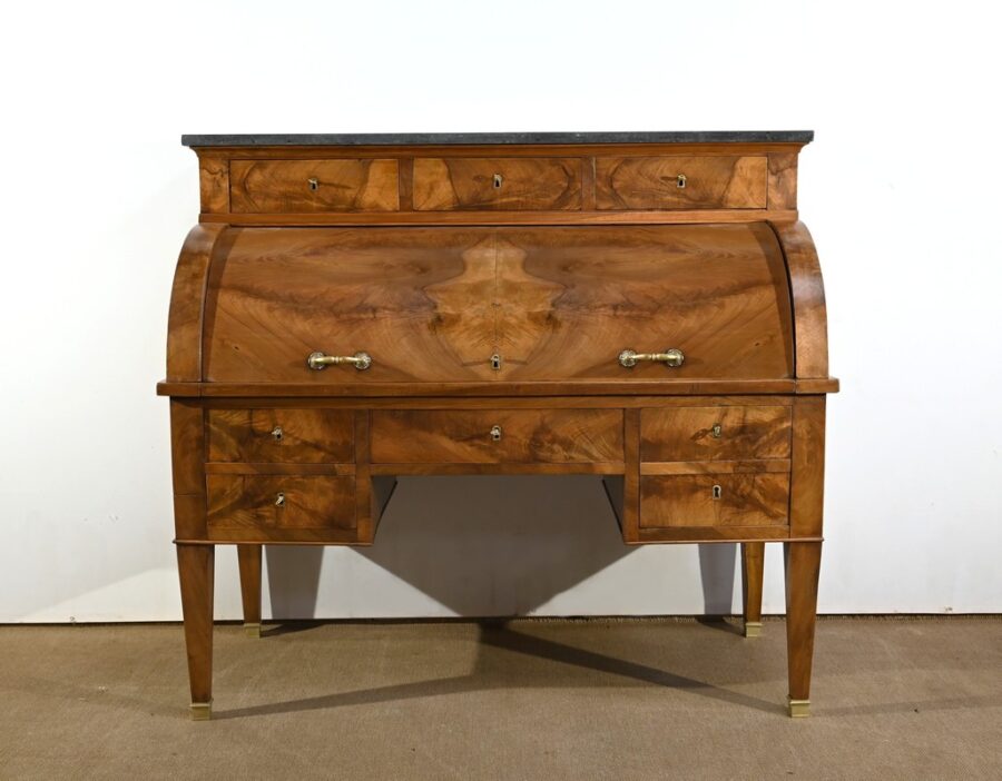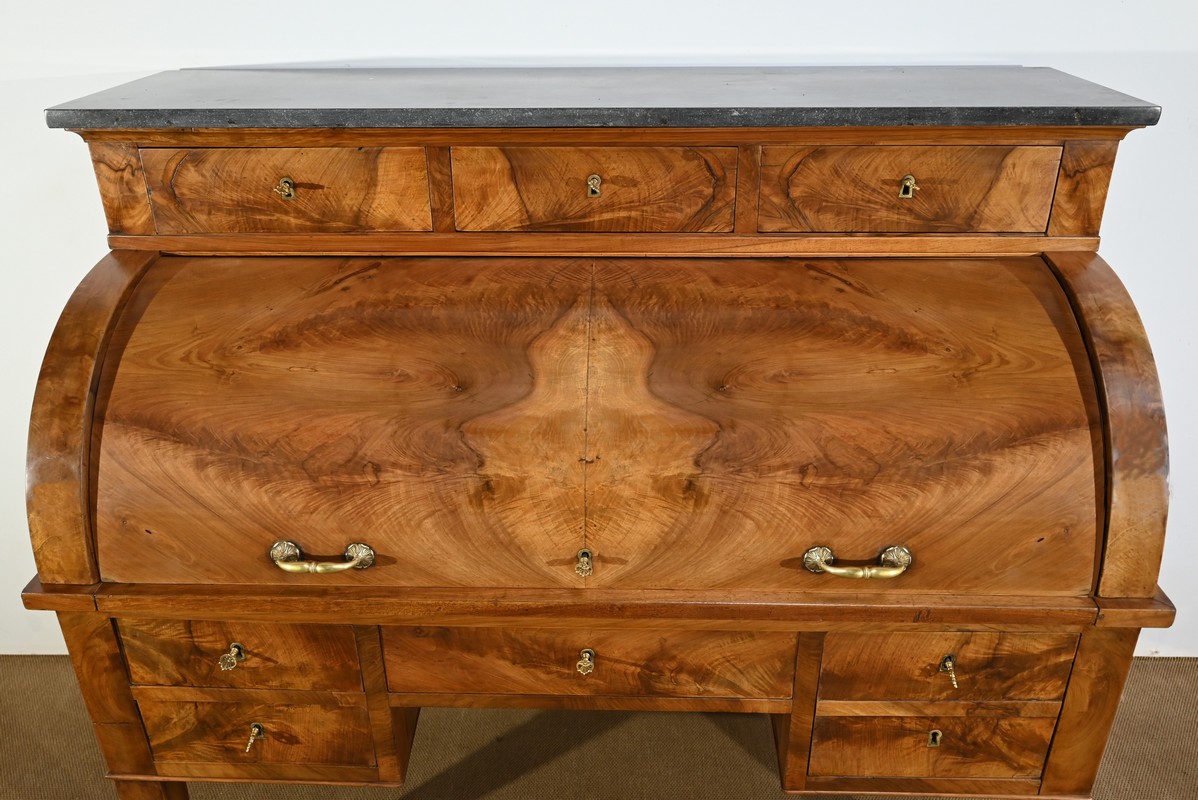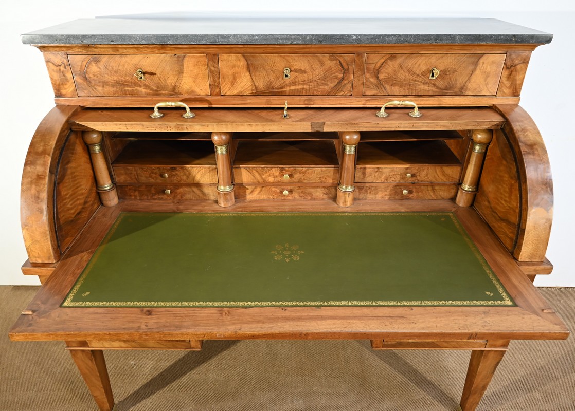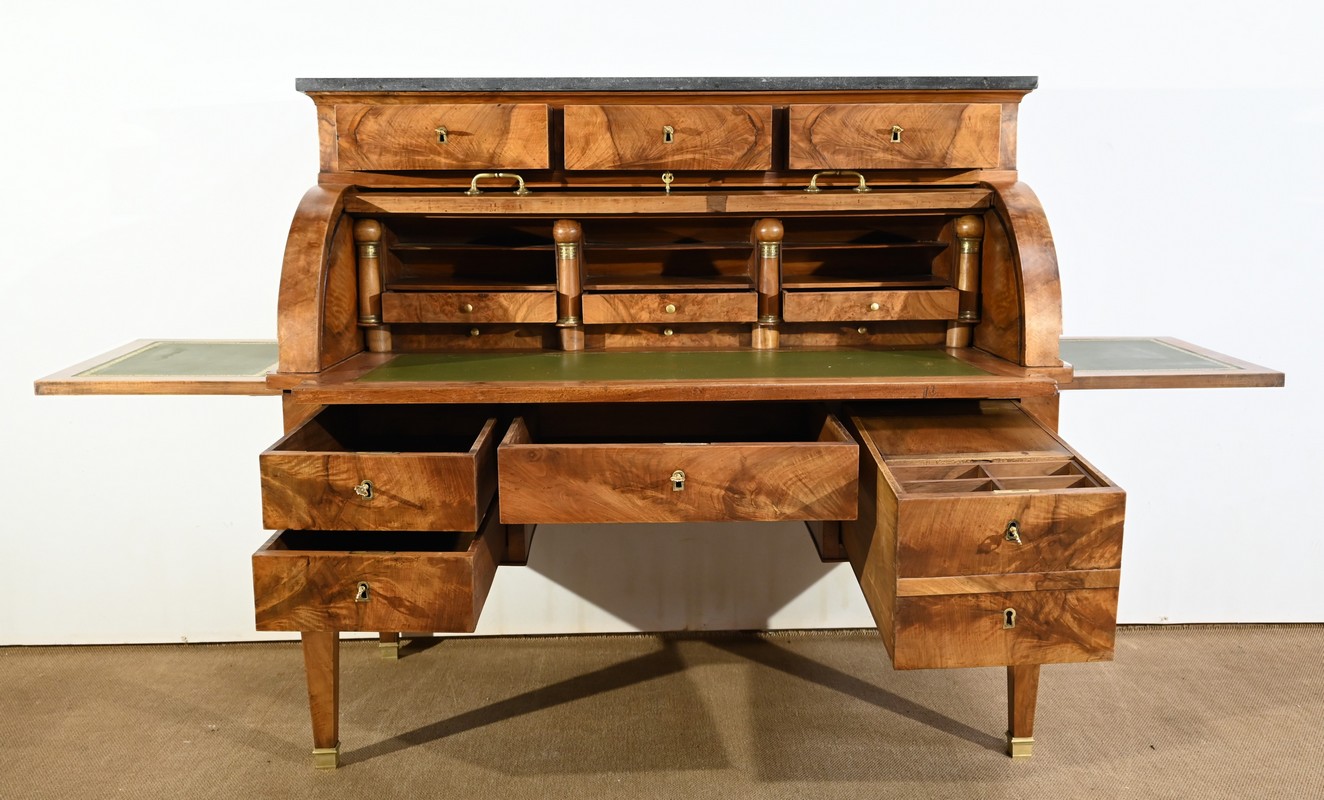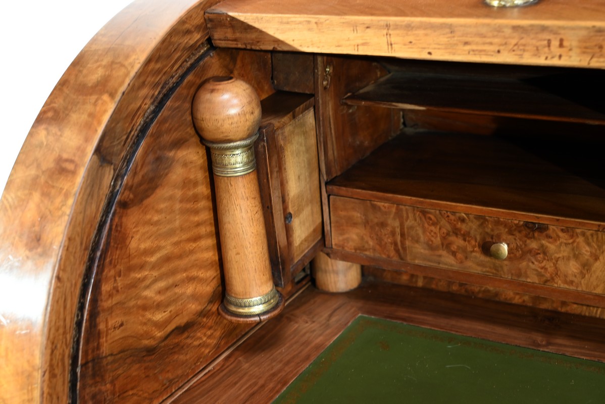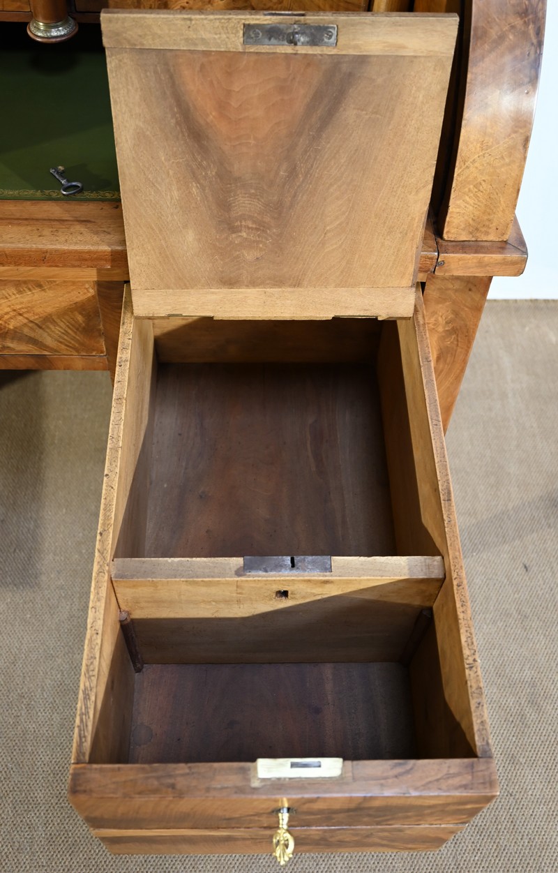 Cet important bureau cylindre toutes faces en noyer massif et plaqué se décline en trois parties.