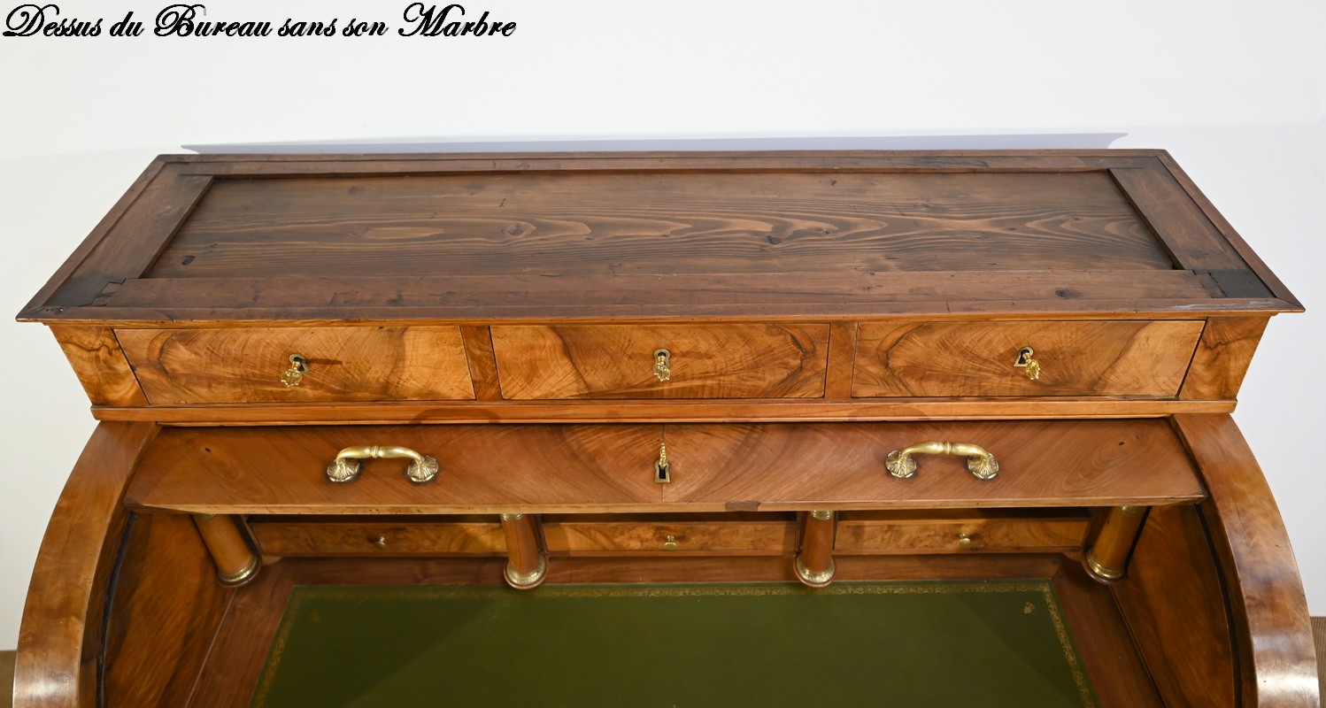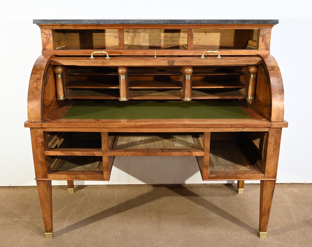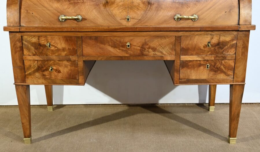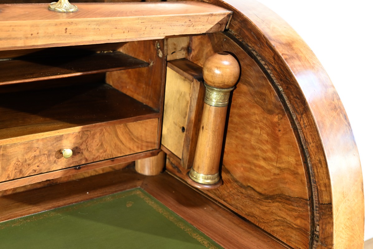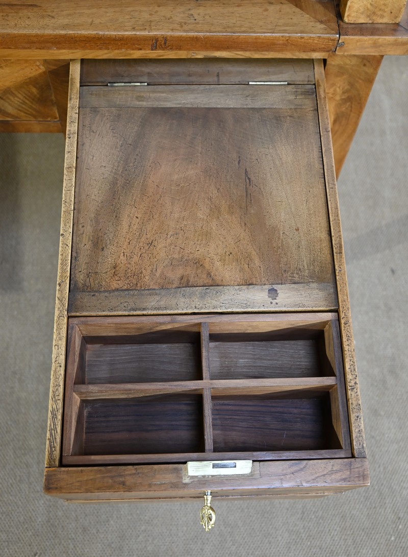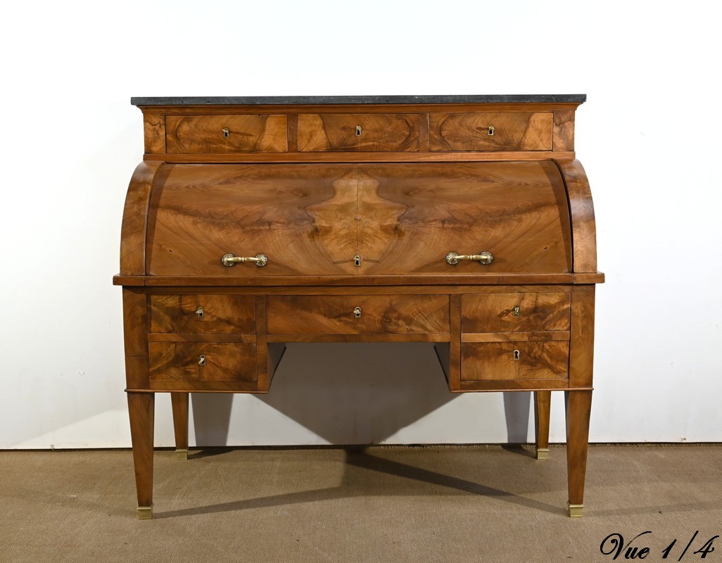 Cet important bureau cylindre toutes faces en noyer massif et plaqué se décline en trois parties.
