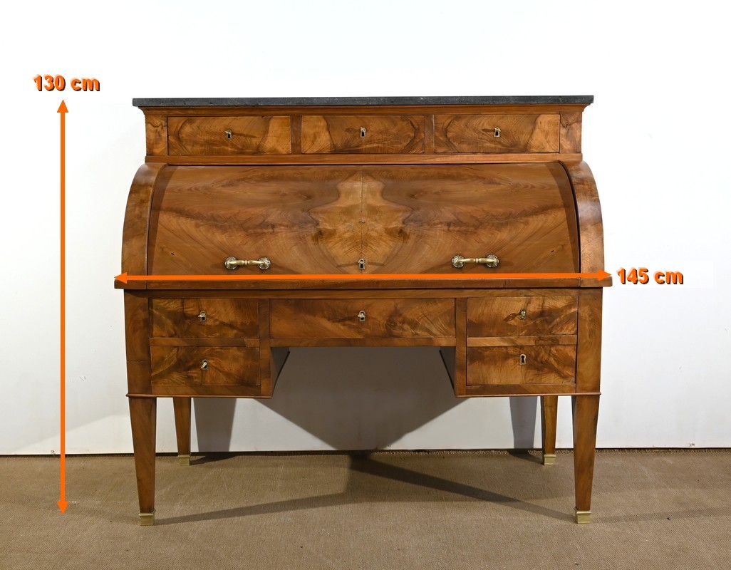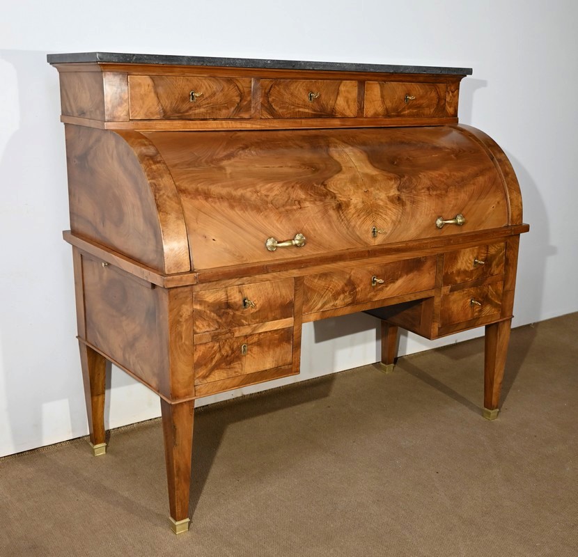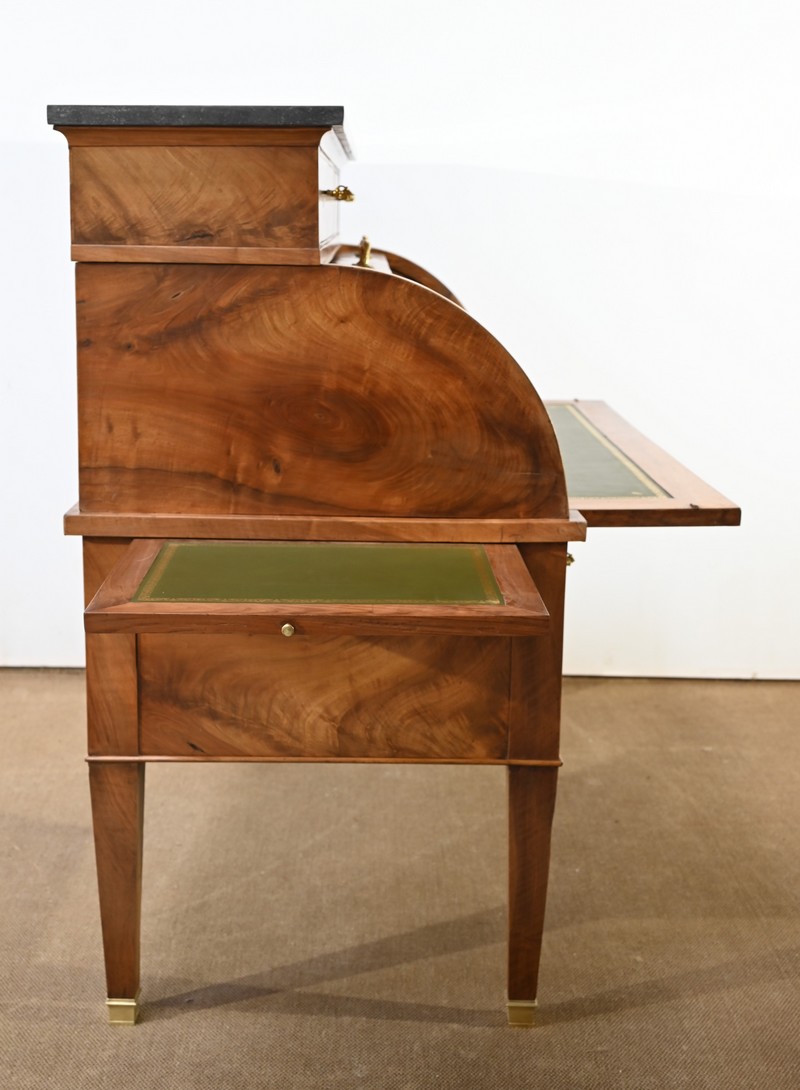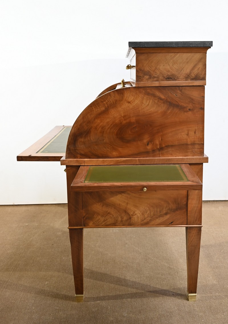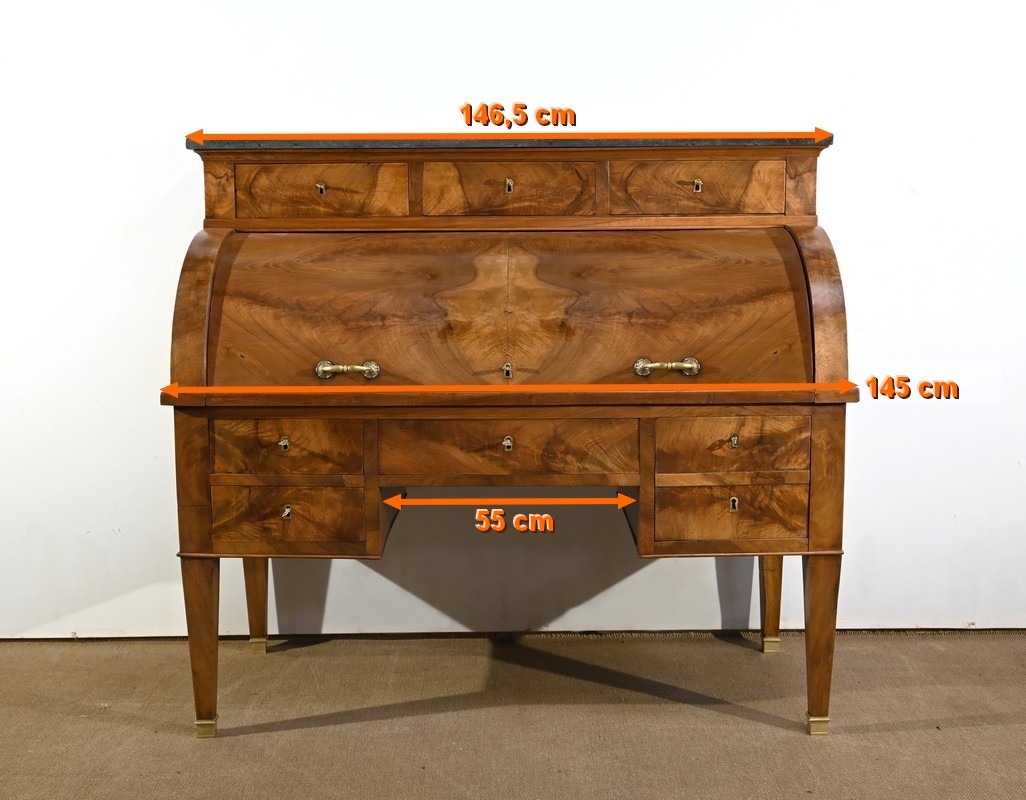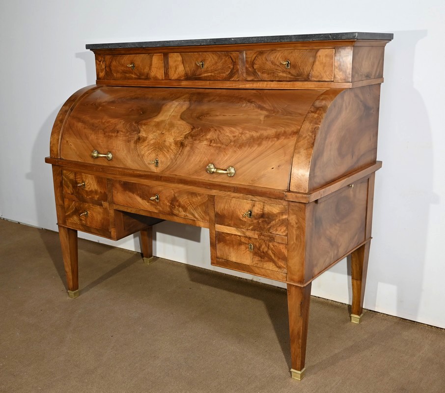 Cet important bureau cylindre toutes faces en noyer massif et plaqué se décline en trois parties.