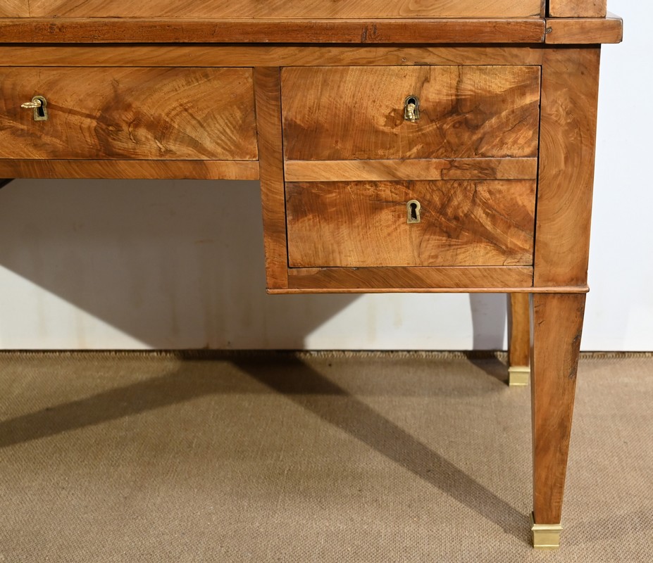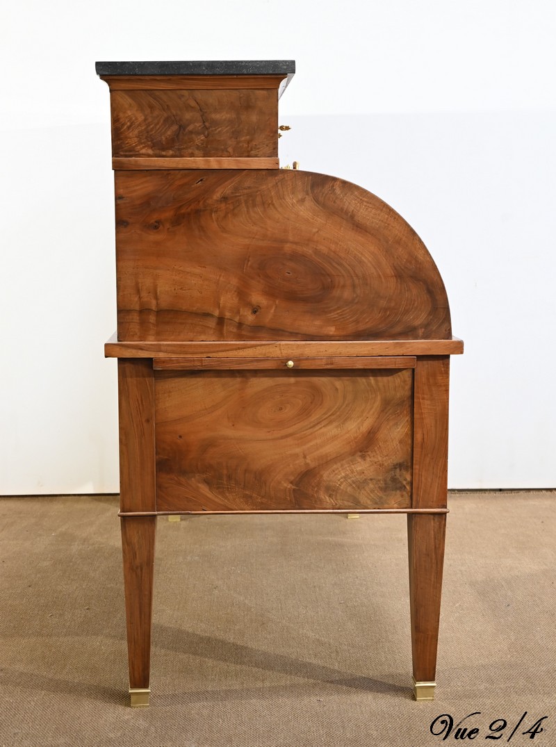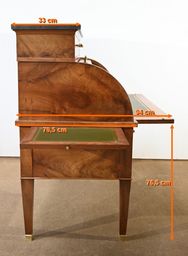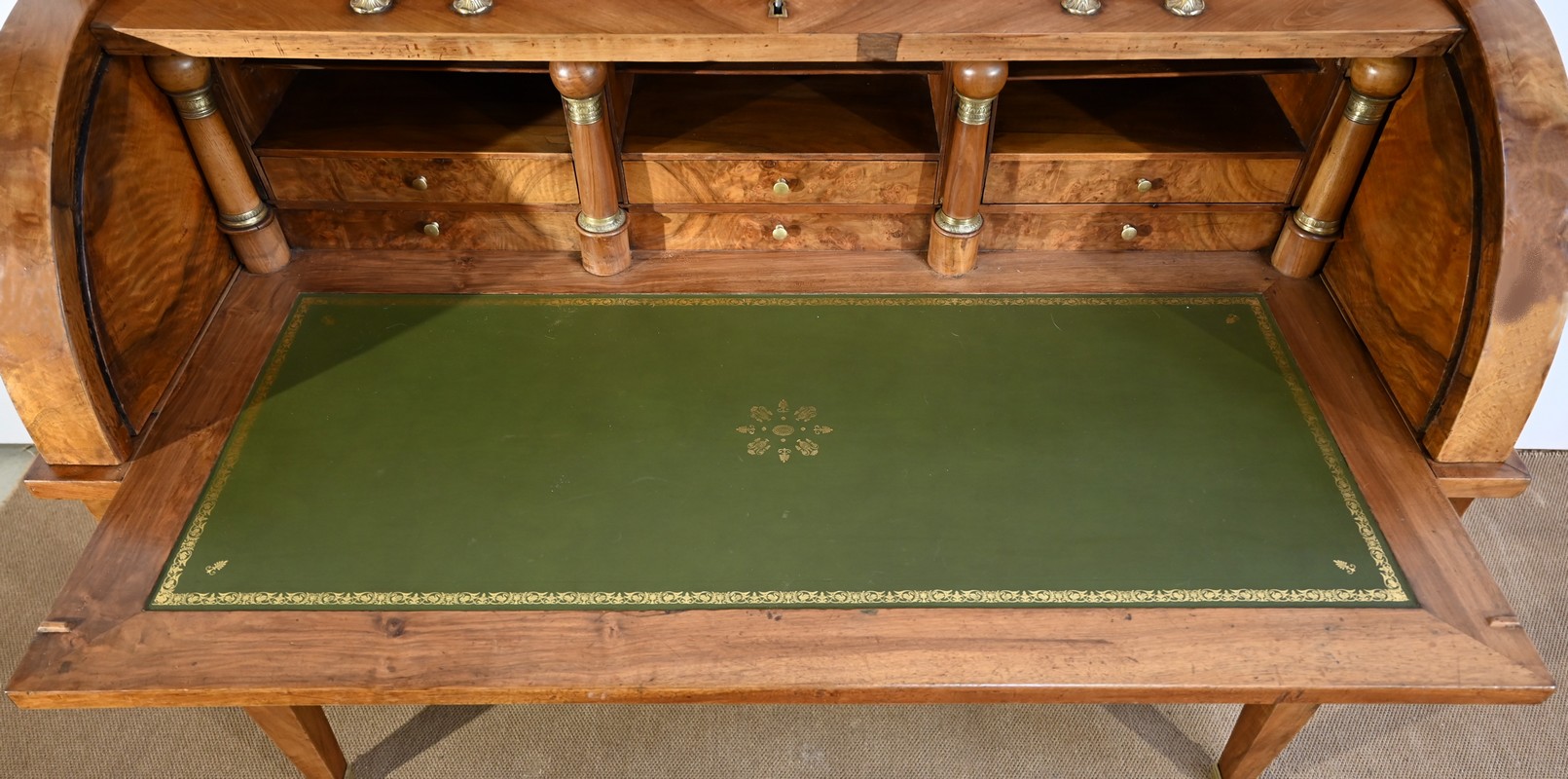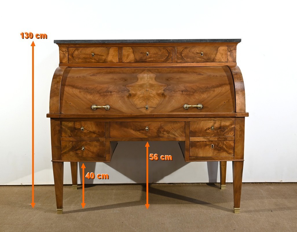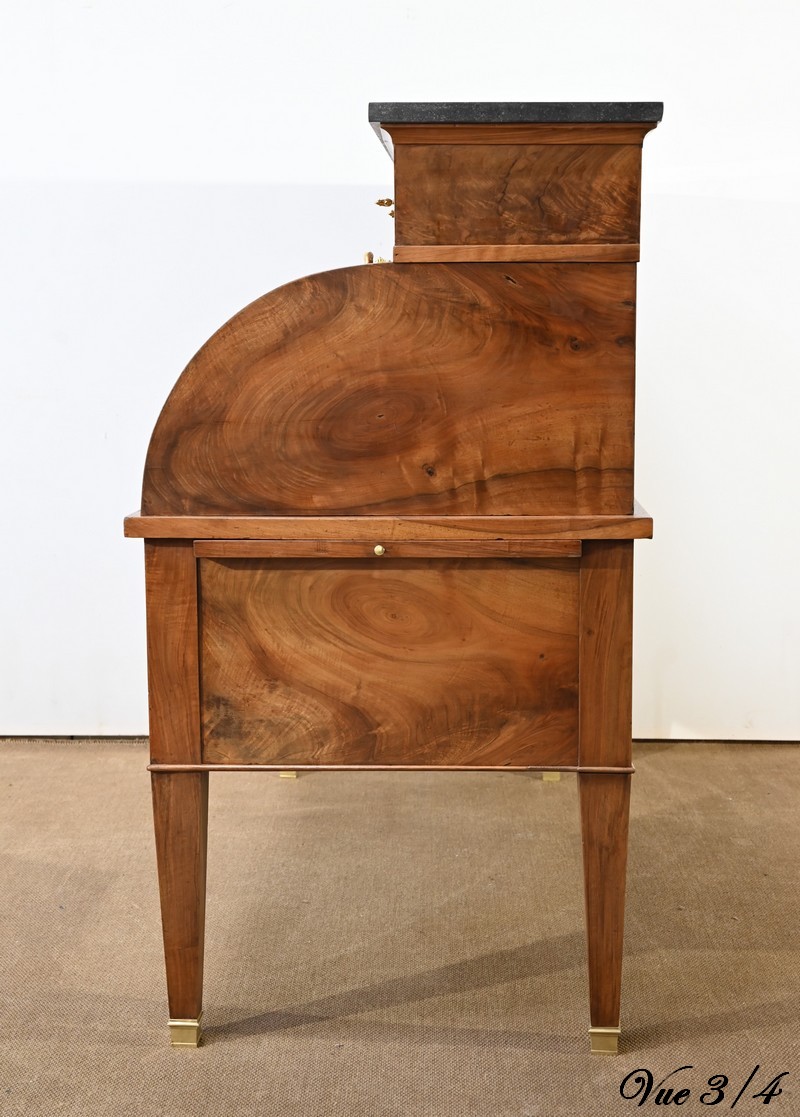 Cet important bureau cylindre toutes faces en noyer massif et plaqué se décline en trois parties.