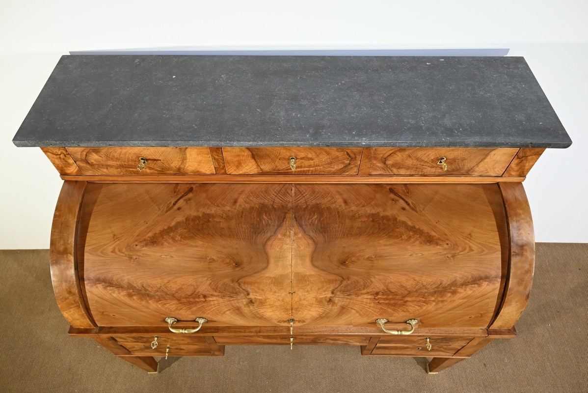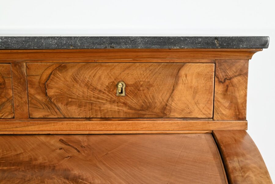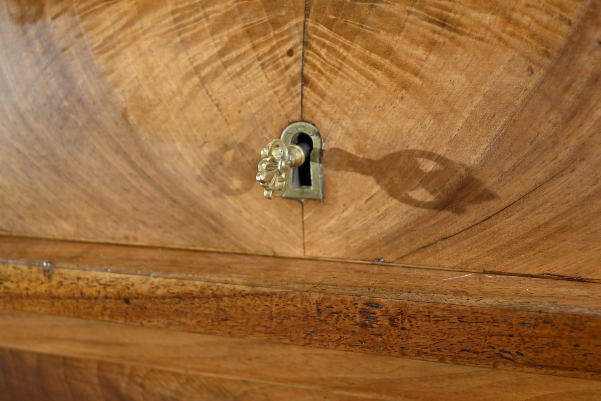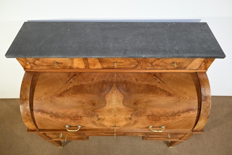 La partie intermédiaire laisse place à un cylindre, en placage en développé avec joint central, muni de deux poignées bronze façonnées, avec serrure horizontale d’origine, entrée et clé.