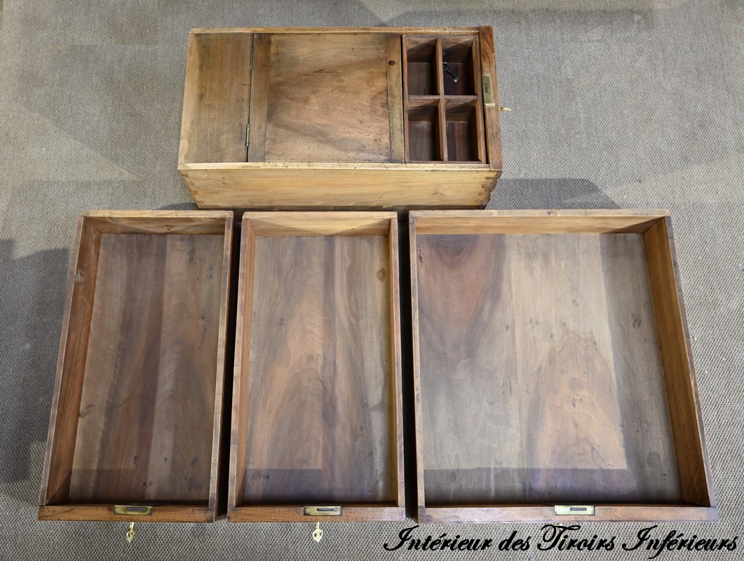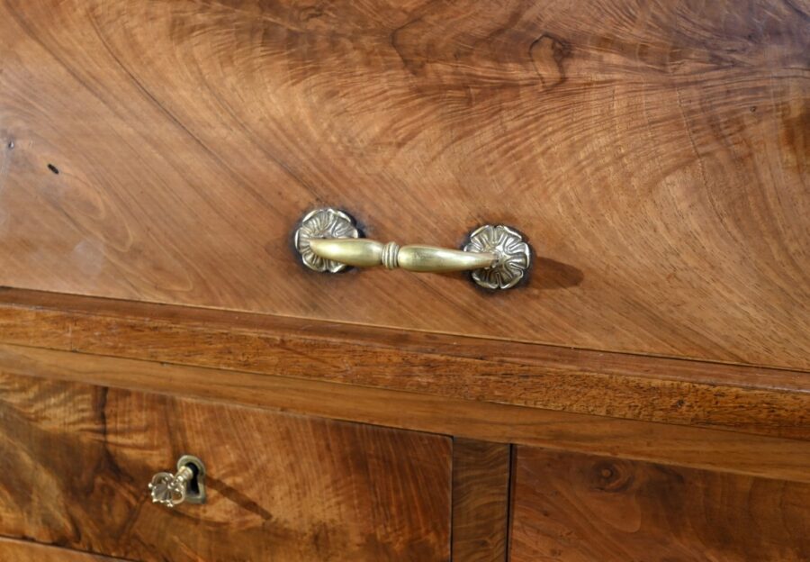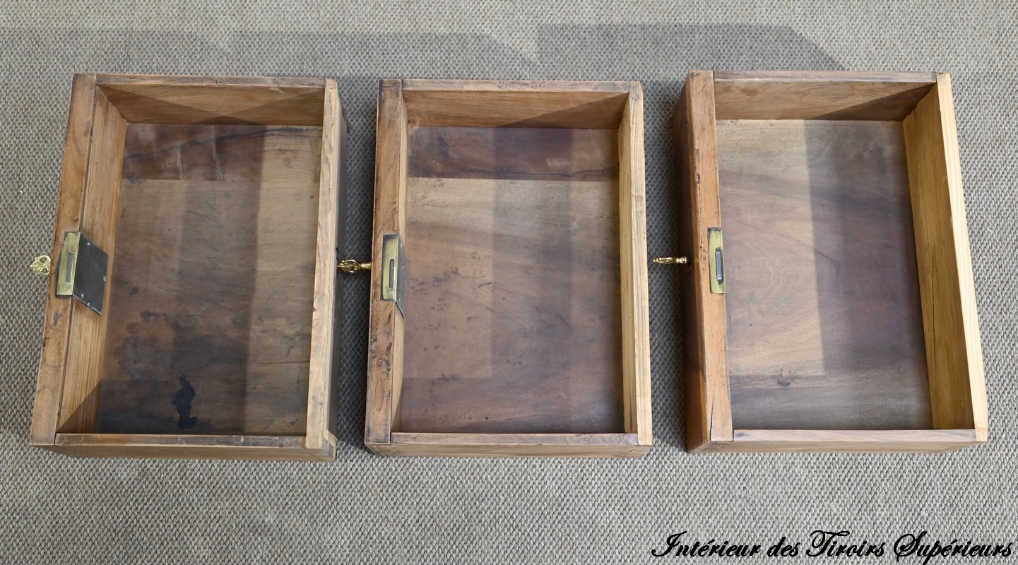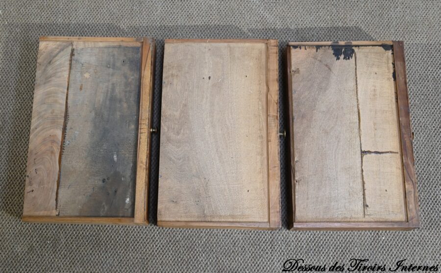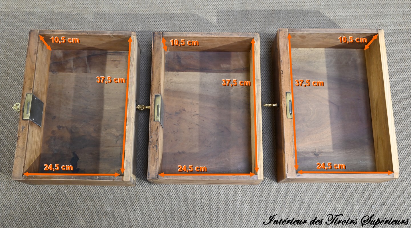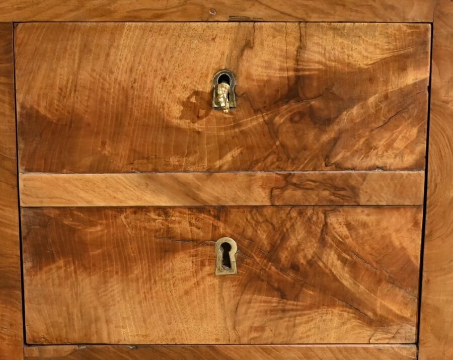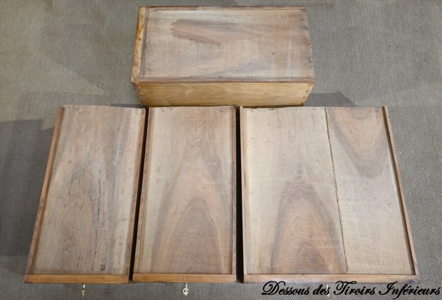 La partie basse présente quatre tiroirs. À savoir, un central ainsi que deux à gauche et un profond à droite, simulant deux façades avec casiers internes et réserve avec abattant et serrure. Toutes ces façades sont en placage de ronce de noyer disposé en développé. Chacun de ces tiroirs dispose d’une serrure authentique fonctionnelle avec entrée incrustée et clé.