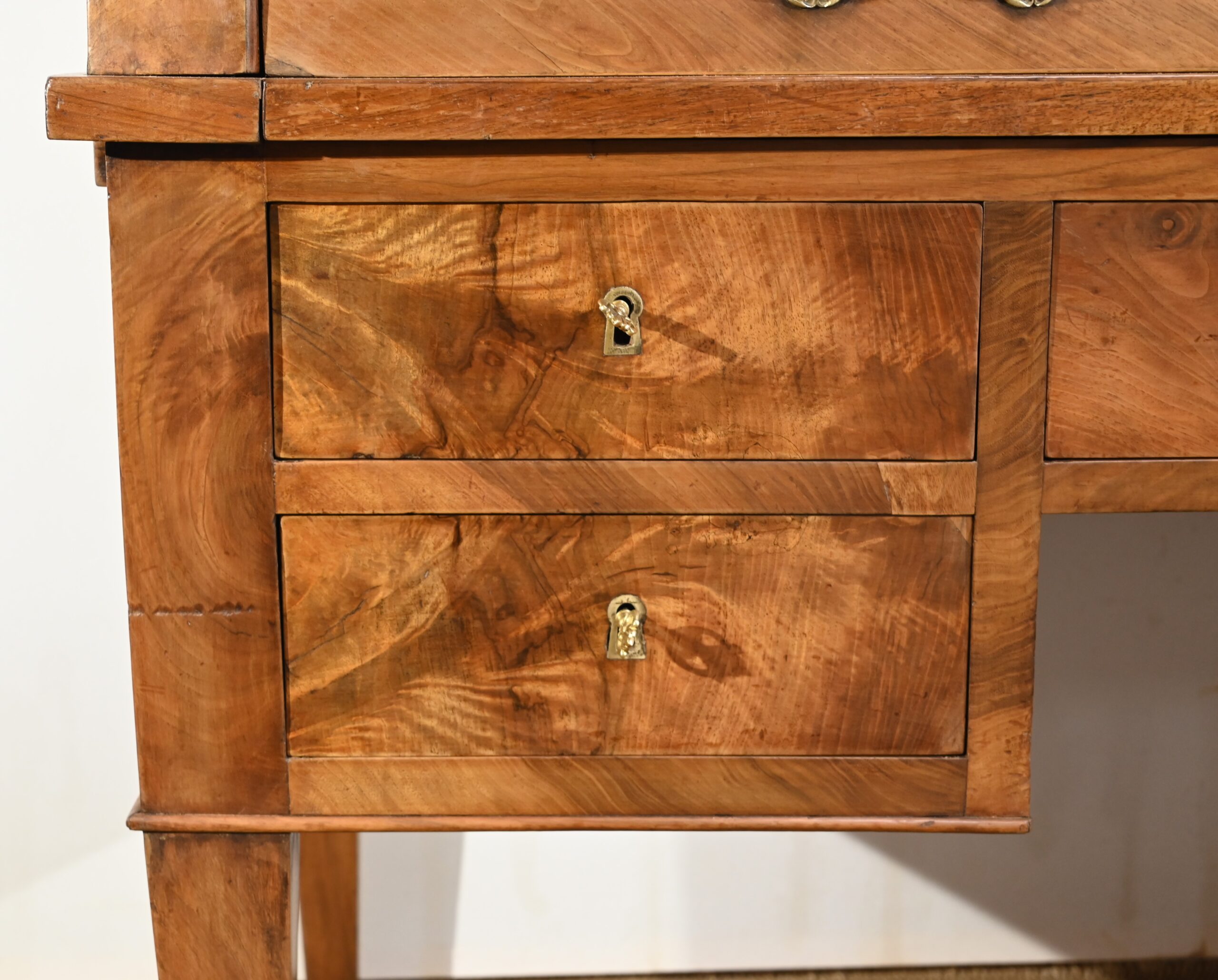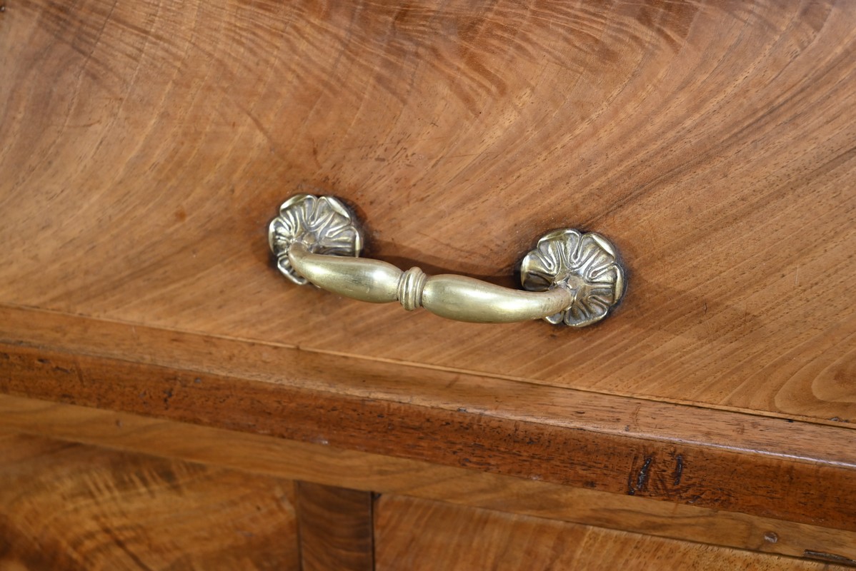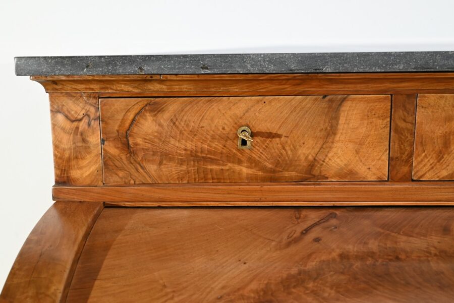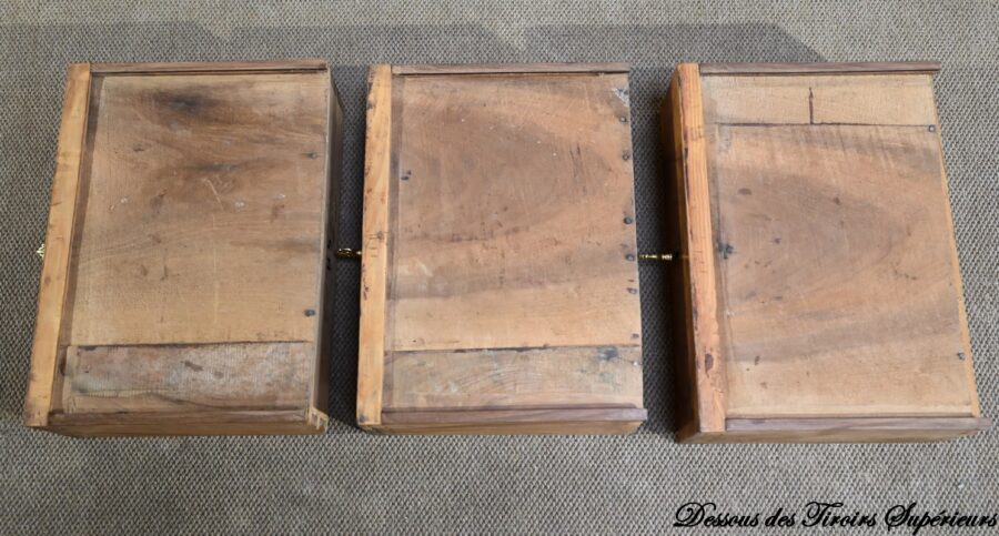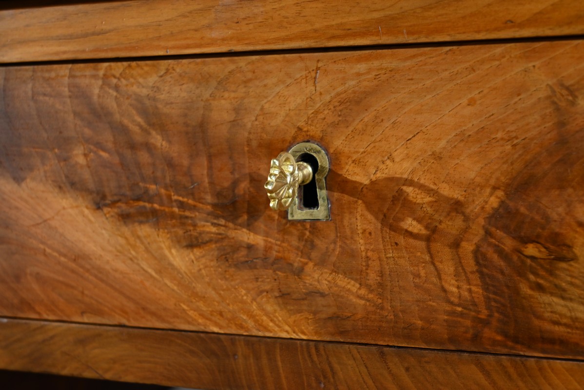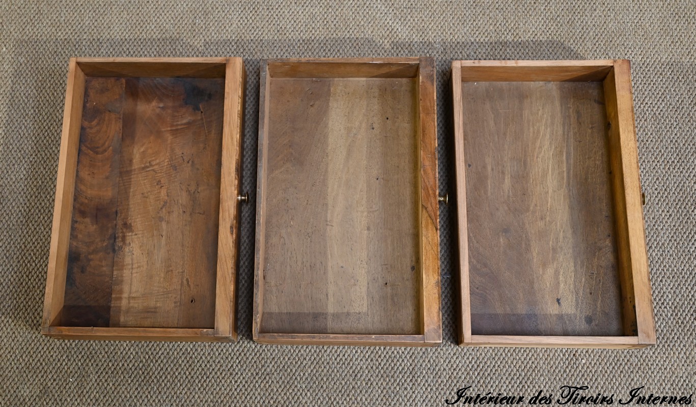 La partie basse présente quatre tiroirs. À savoir, un central ainsi que deux à gauche et un profond à droite, simulant deux façades avec casiers internes et réserve avec abattant et serrure. Toutes ces façades sont en placage de ronce de noyer disposé en développé. Chacun de ces tiroirs dispose d’une serrure authentique fonctionnelle avec entrée incrustée et clé.