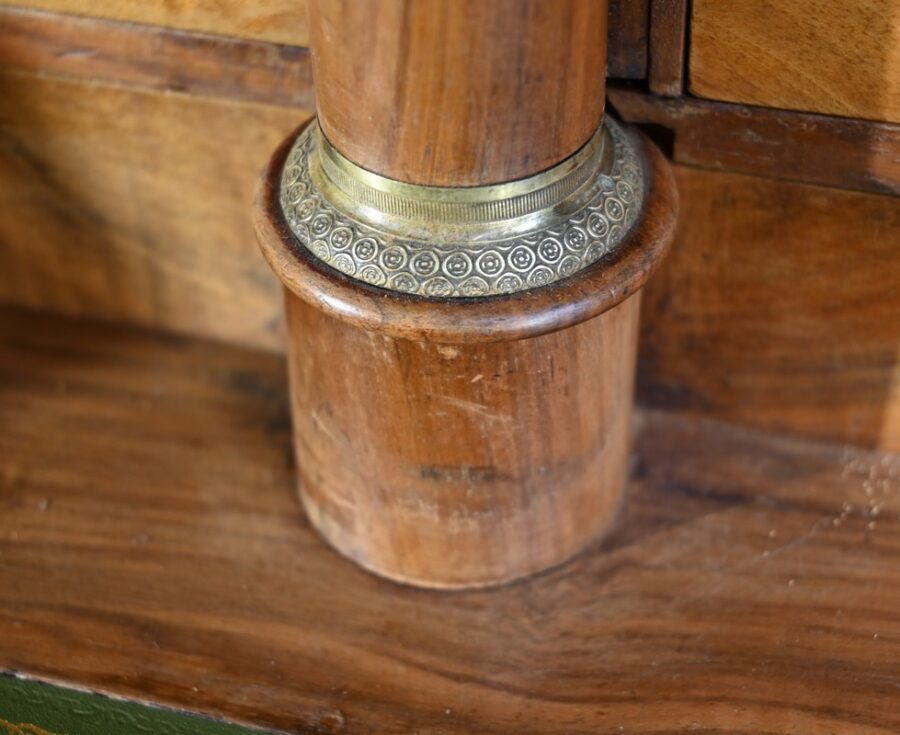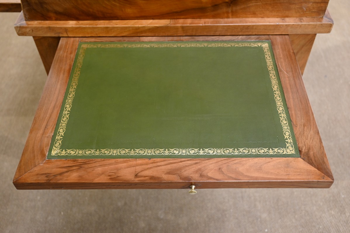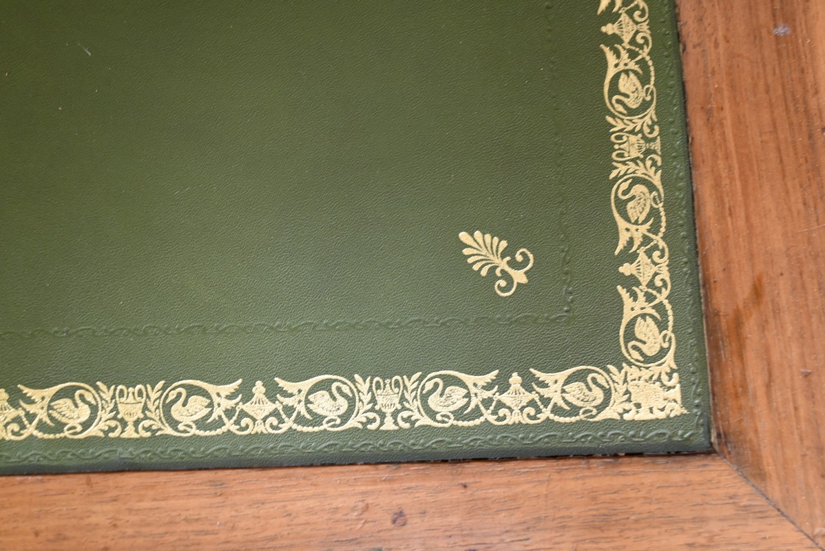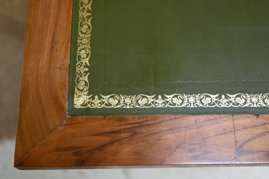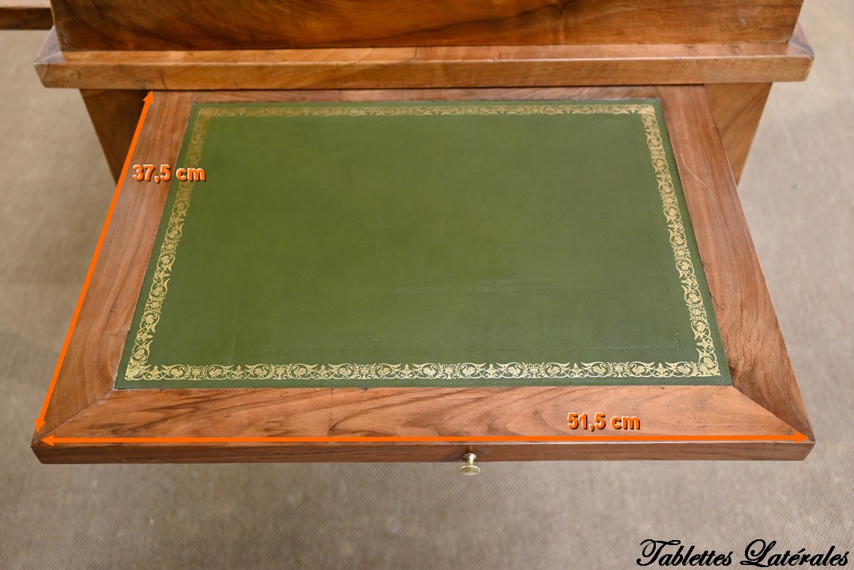Les côtés de bureau, en ramage de ronces de noyer, proposent chacun une tablette à bouton laiton, foncée d’un cuir refait, de couleur sapin, avec vignettes à froid et dorées.