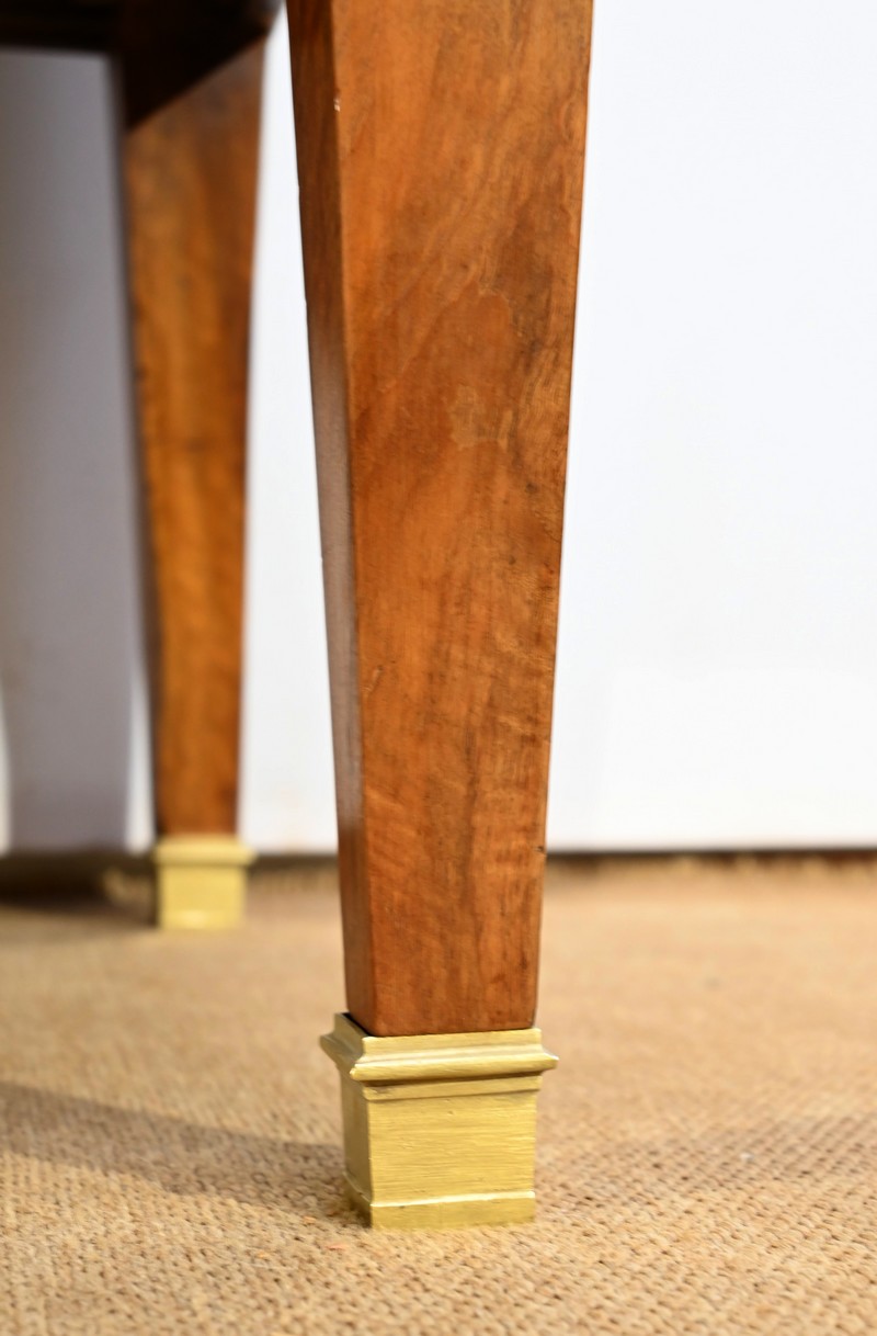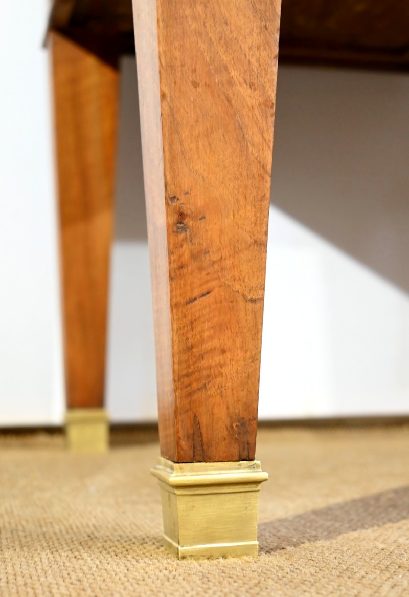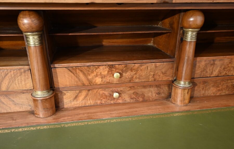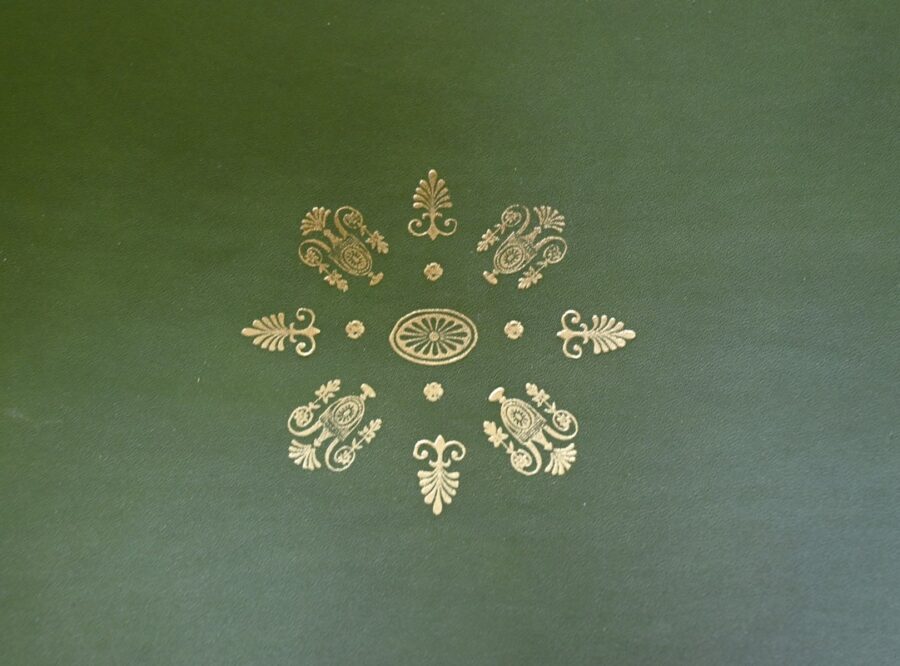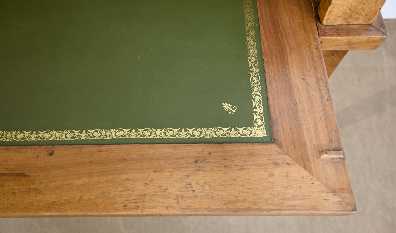 Les côtés de bureau, en ramage de ronces de noyer, proposent chacun une tablette à bouton laiton, foncée d’un cuir refait, de couleur sapin, avec vignettes à froid et dorées.