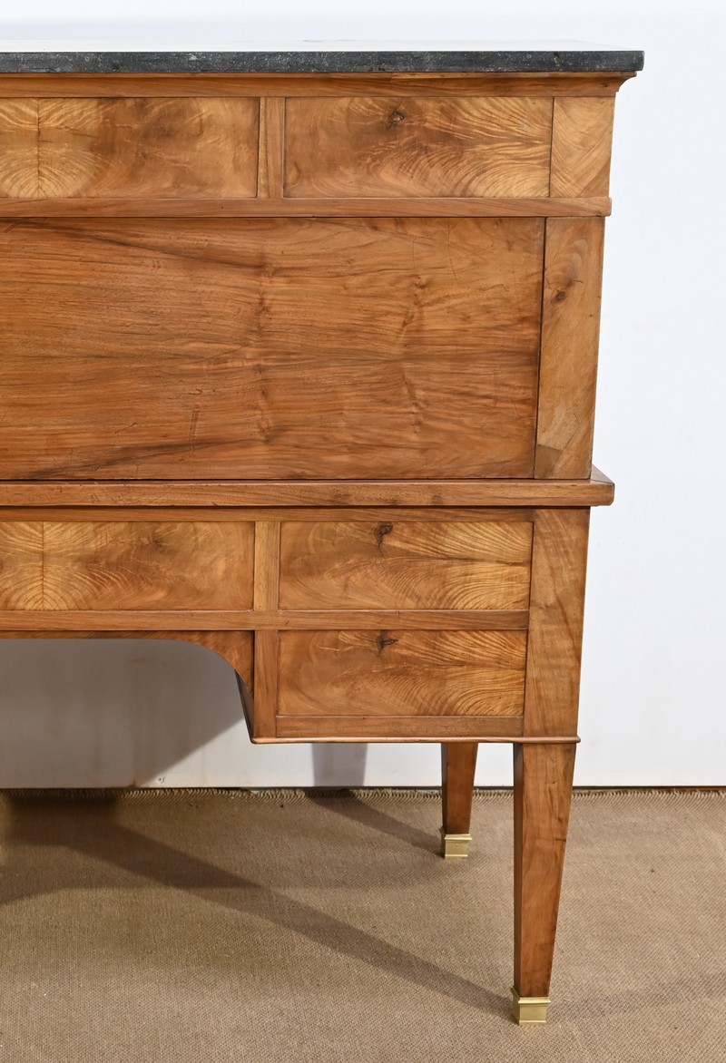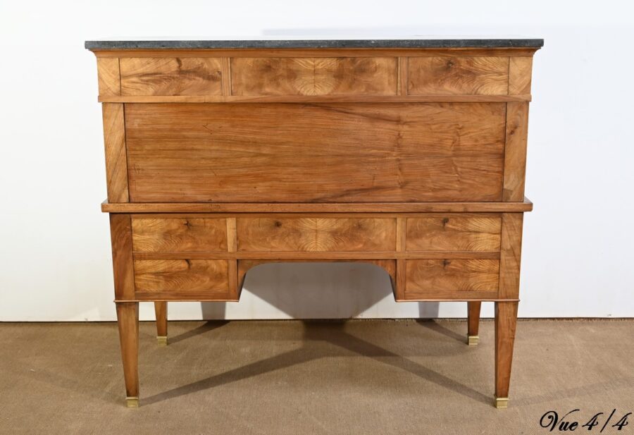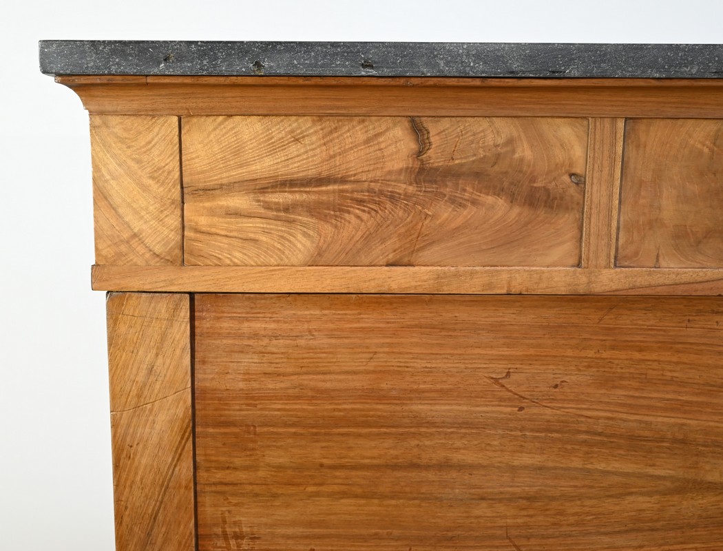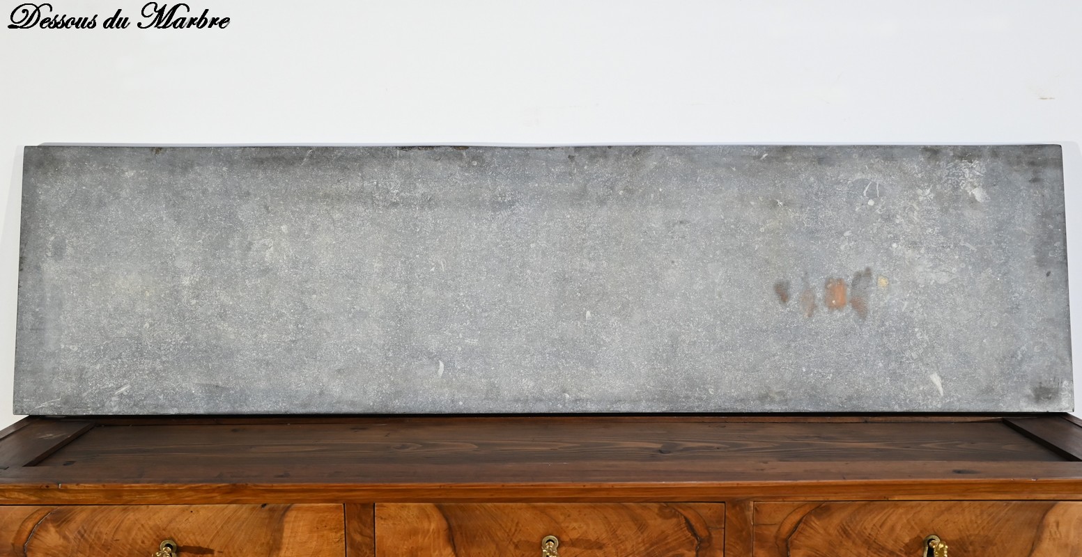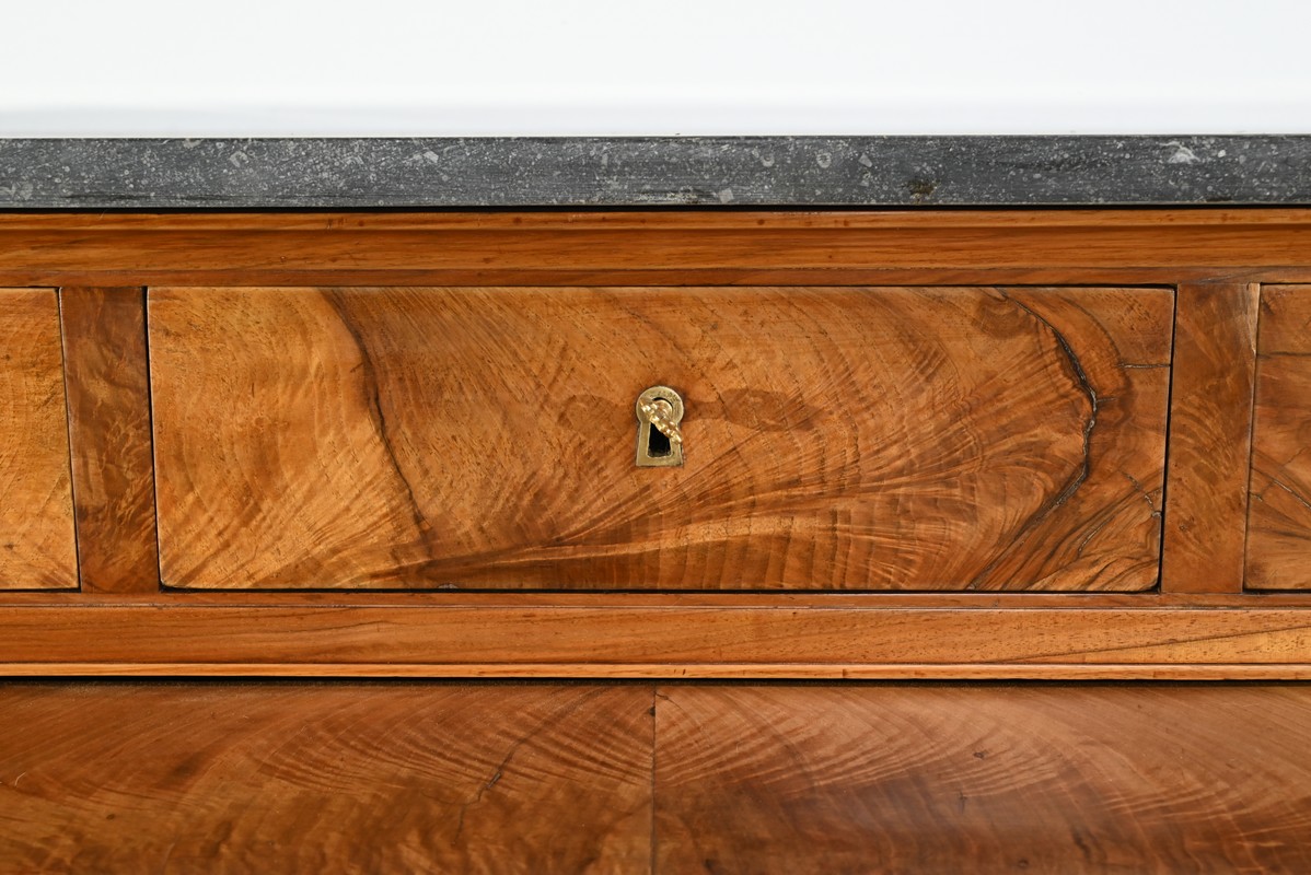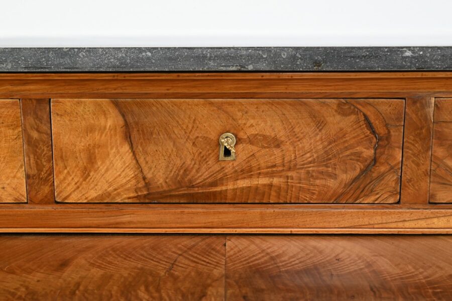 Pour finir, la partie supérieure qui comprend une rangée de trois tiroirs, de composition similaire, est sommée d’un marbre granité belge en parfait état.
