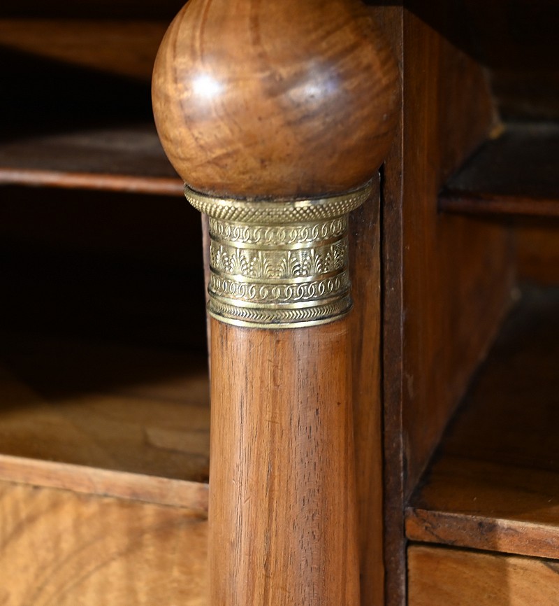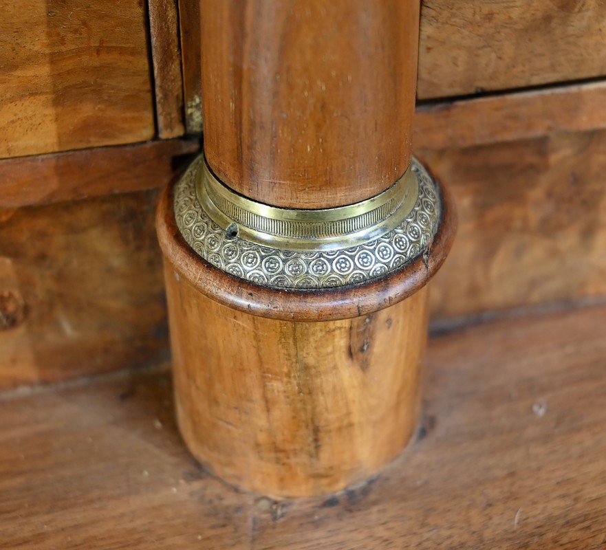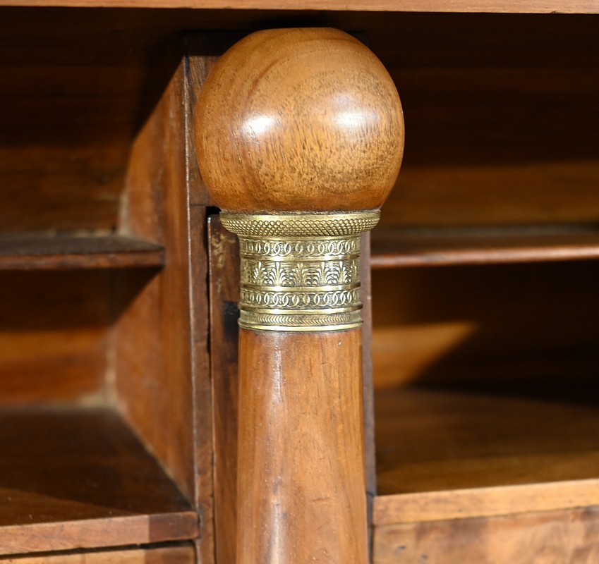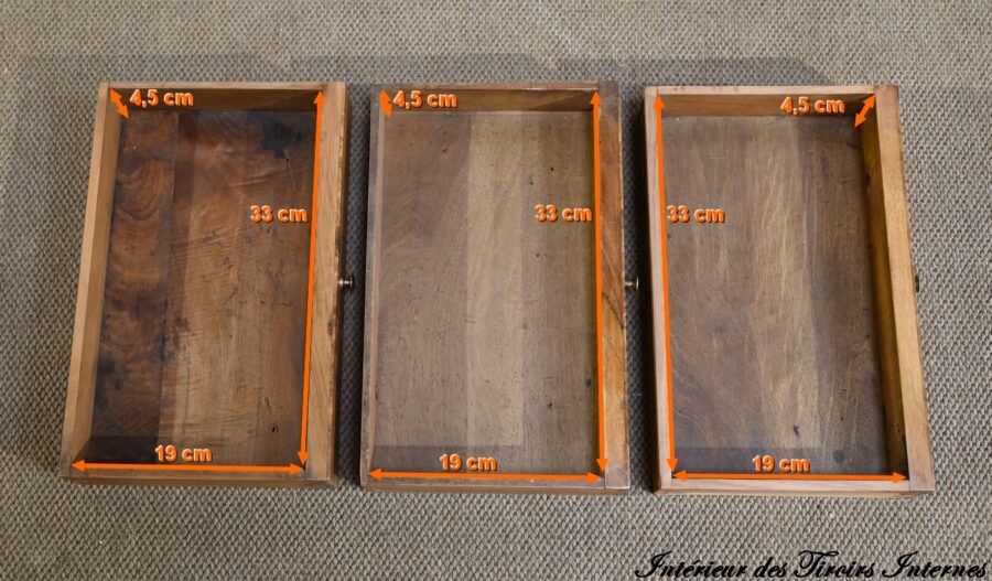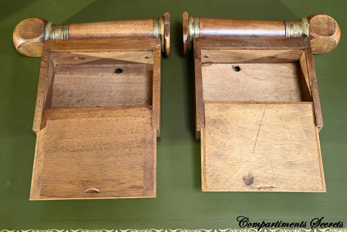 Ces tiroirs internes sont séparés par quatre colonnettes dont deux recèlent des cavités secrètes.