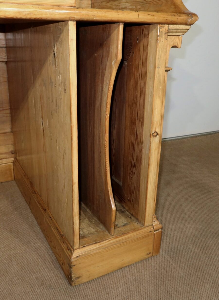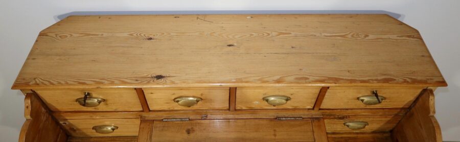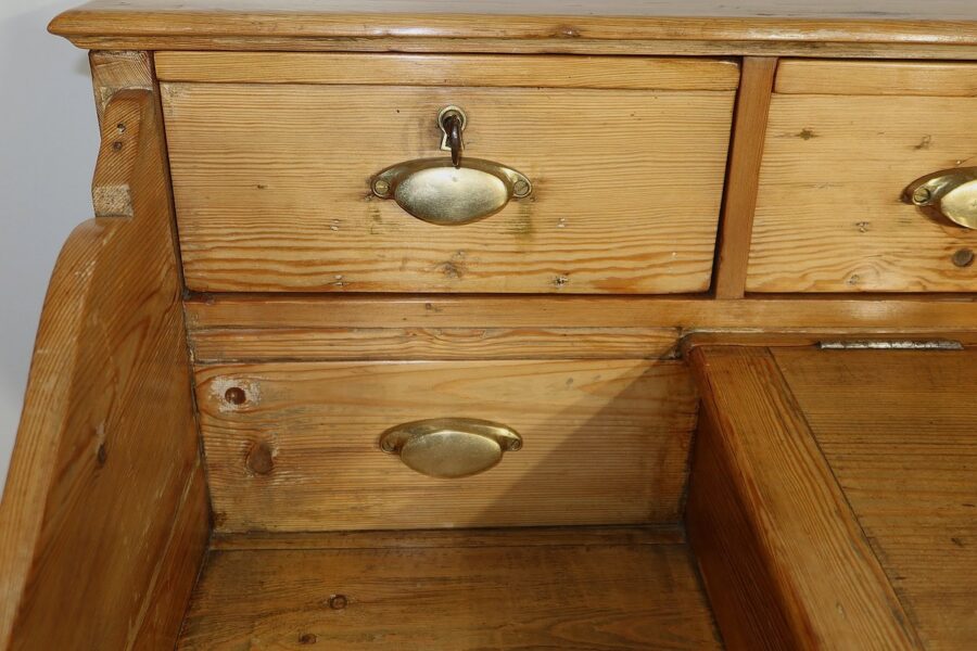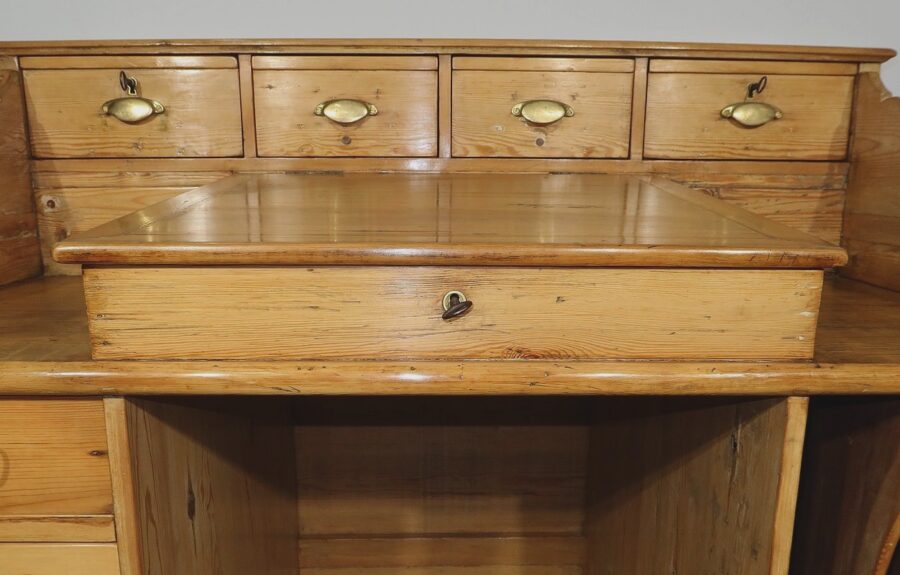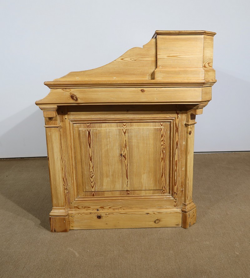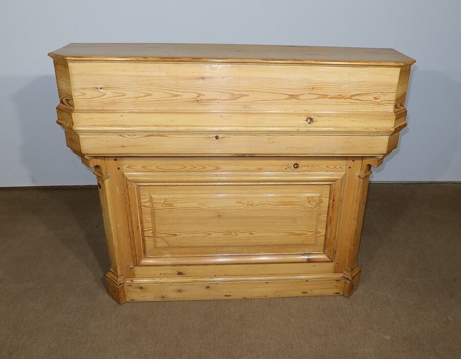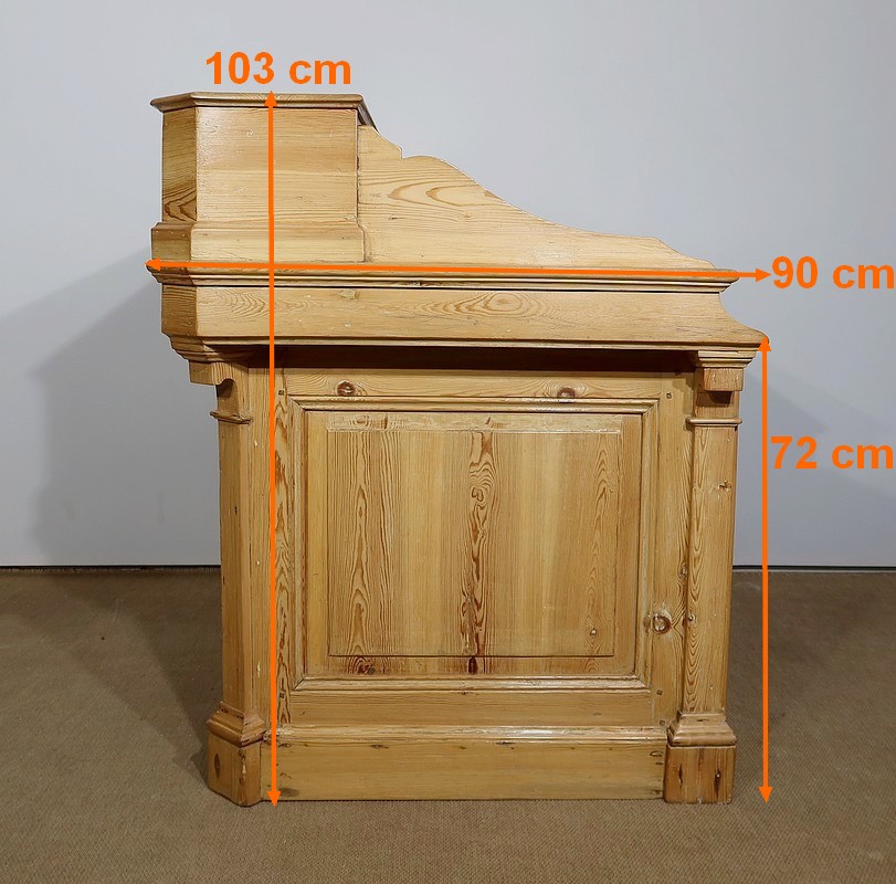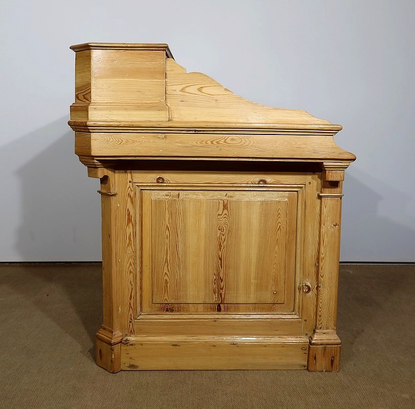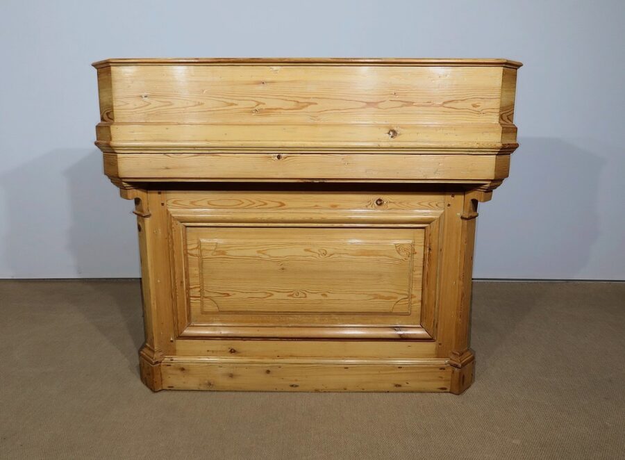 Grand bureau de commerce en pitchpin massif présentant une face « client » composée d’un large panneau horizontal à plate-bande et gorge, entouré d’une moulure en demi-rond et à coupe d’onglet. Les montants sont à pans coupés et les côtés sont également à plate-bande et mouluration autour reposant sur une plinthe dont le dessus est à gorge.