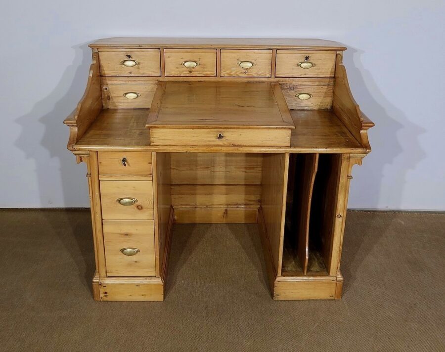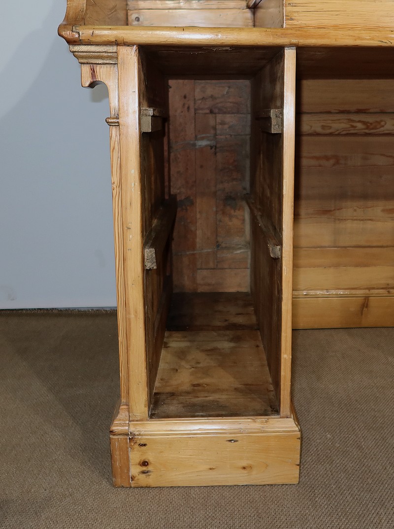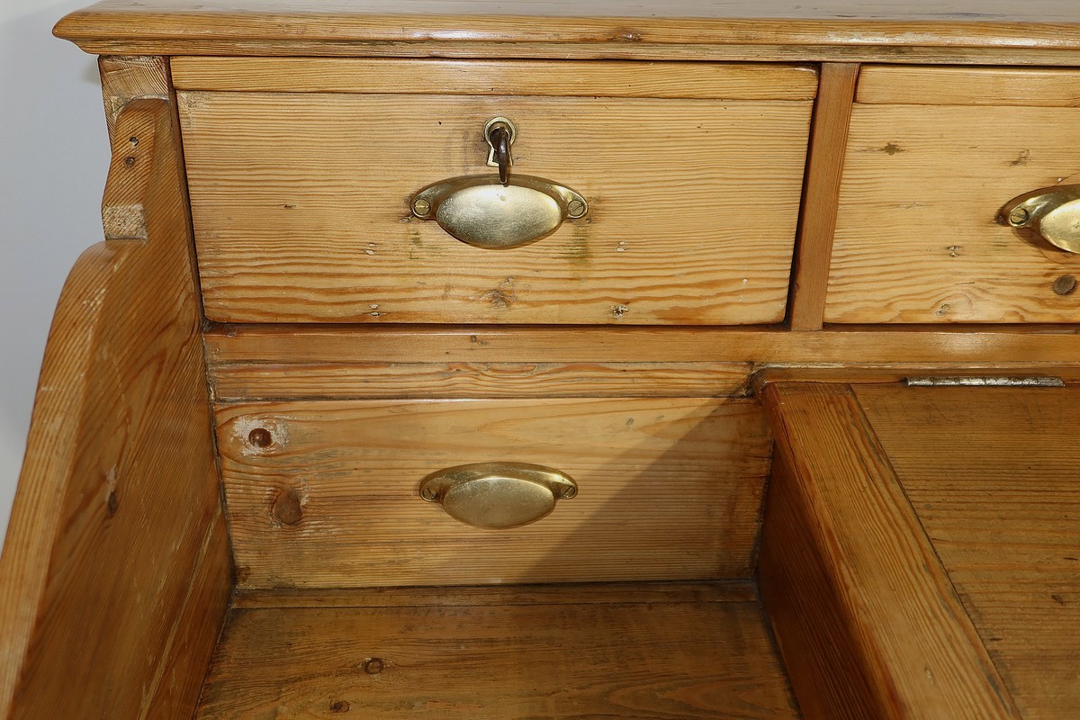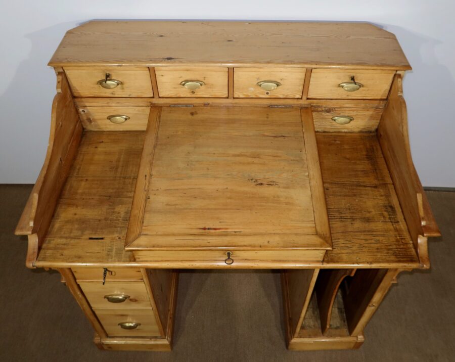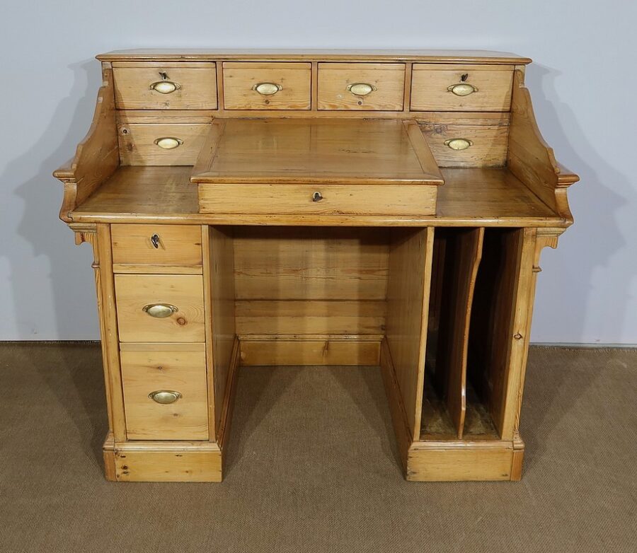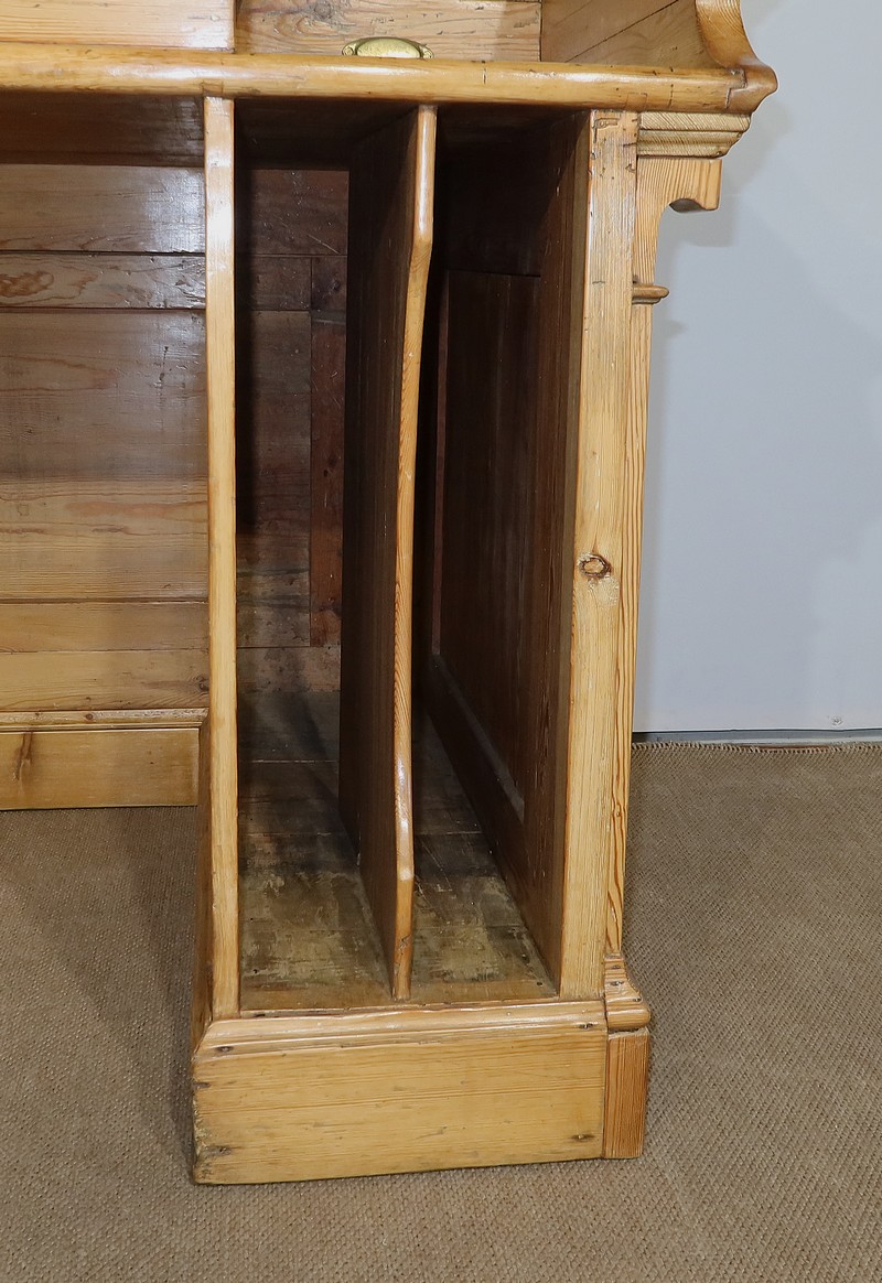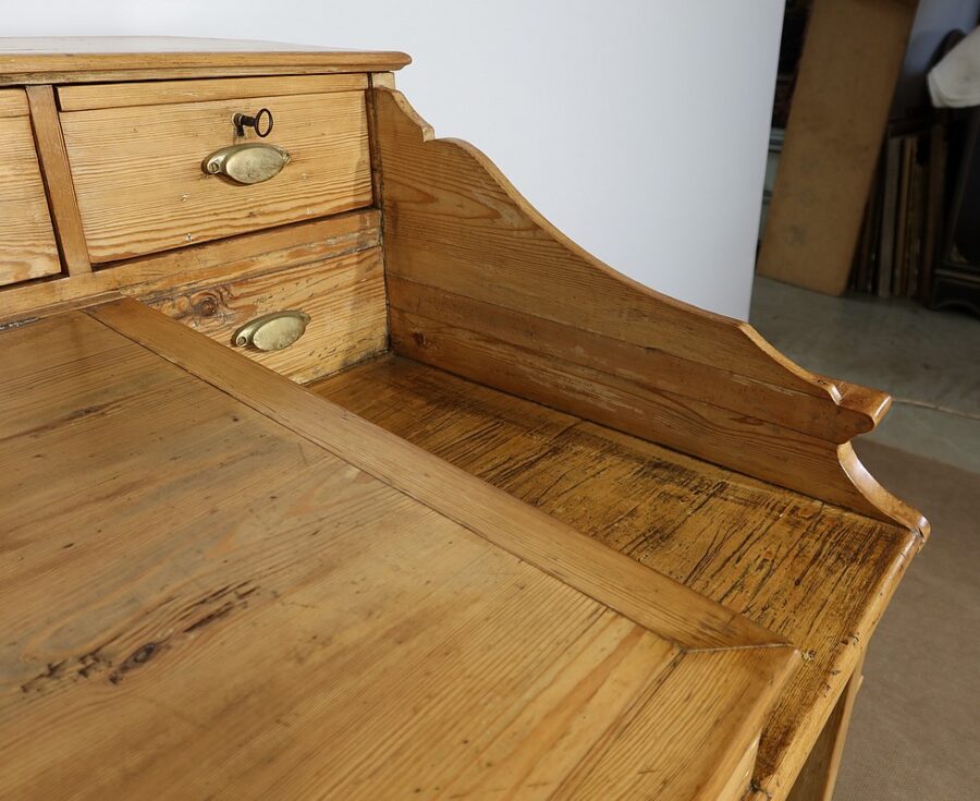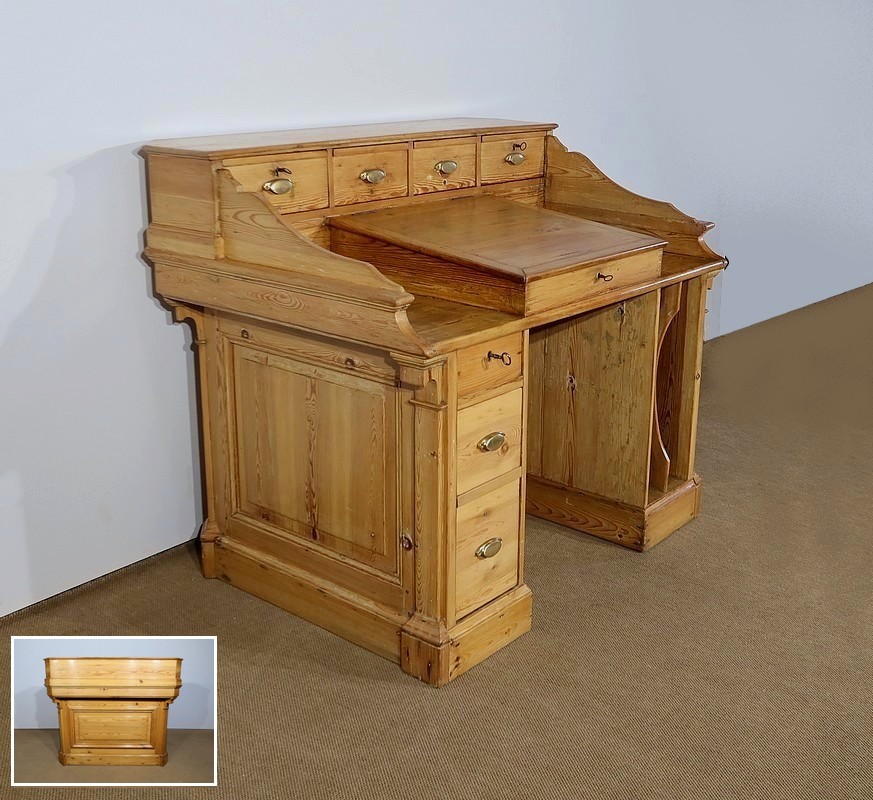 Grand bureau de commerce en pitchpin massif présentant une face « client » composée d’un large panneau horizontal à plate-bande et gorge, entouré d’une moulure en demi-rond et à coupe d’onglet. Les montants sont à pans coupés et les côtés sont également à plate-bande et mouluration autour reposant sur une plinthe dont le dessus est à gorge.