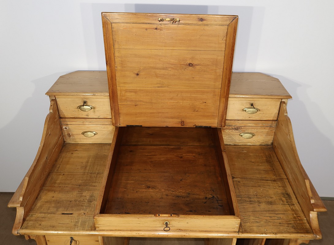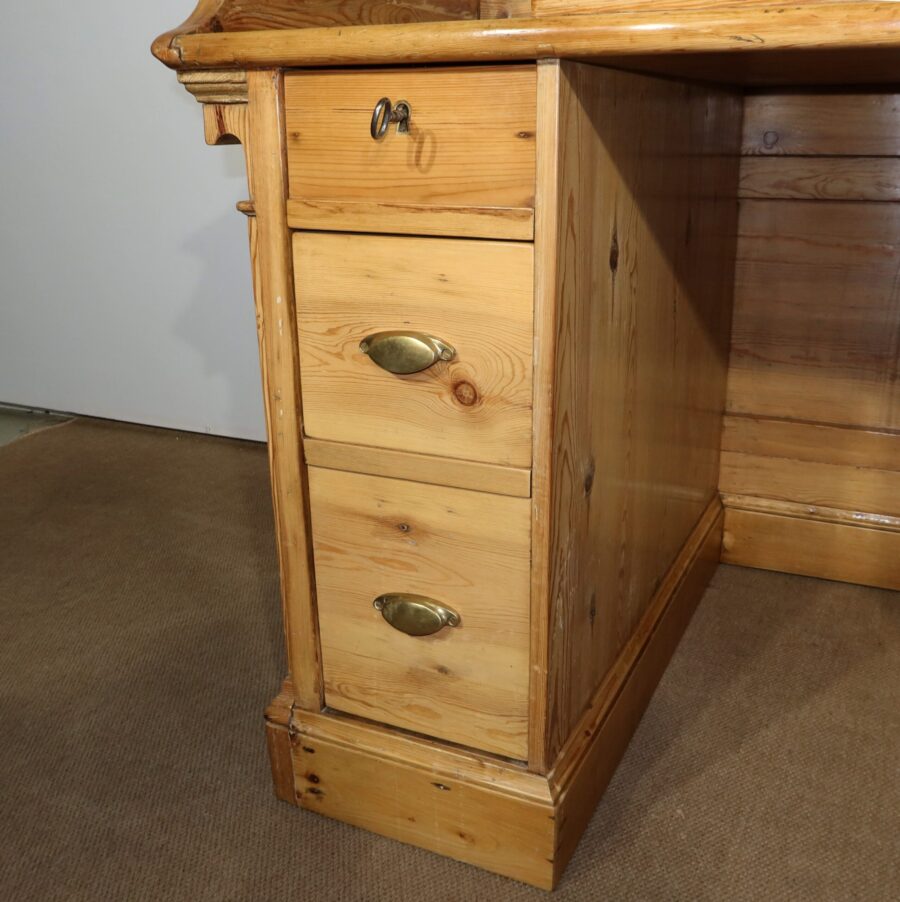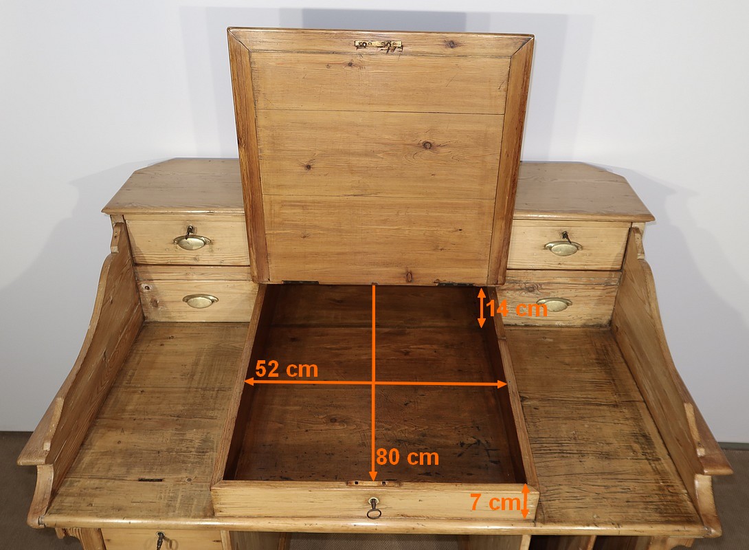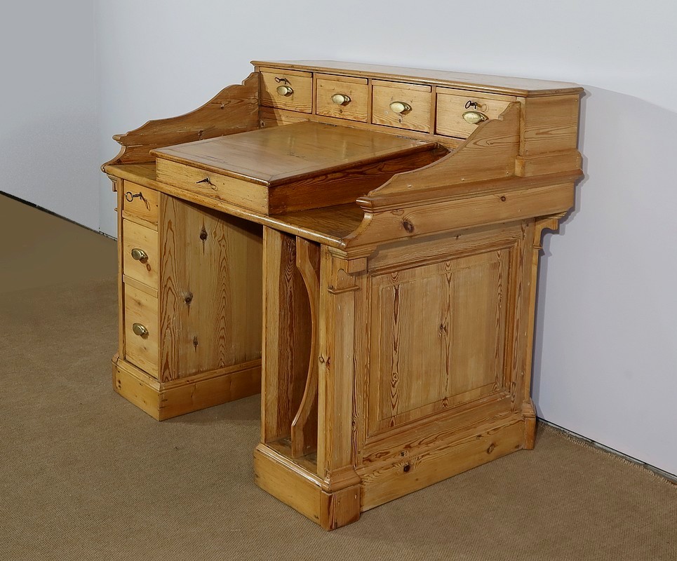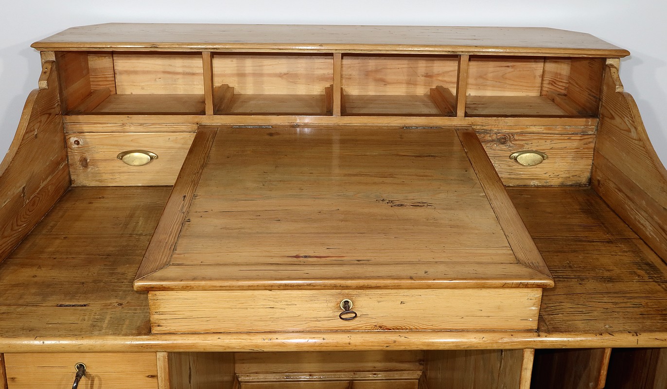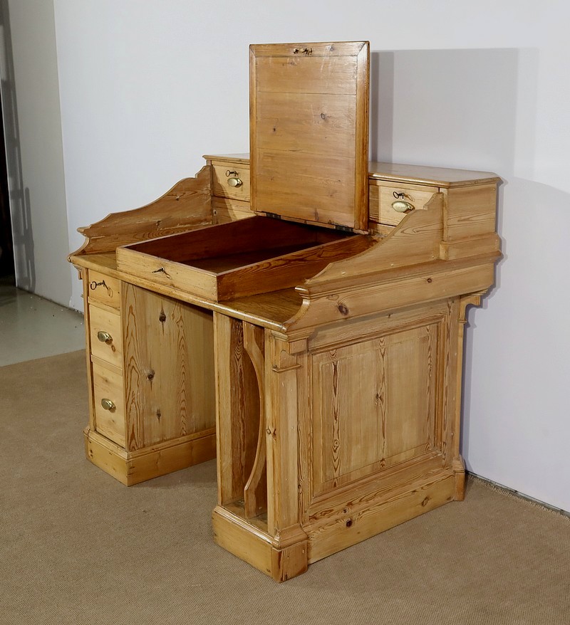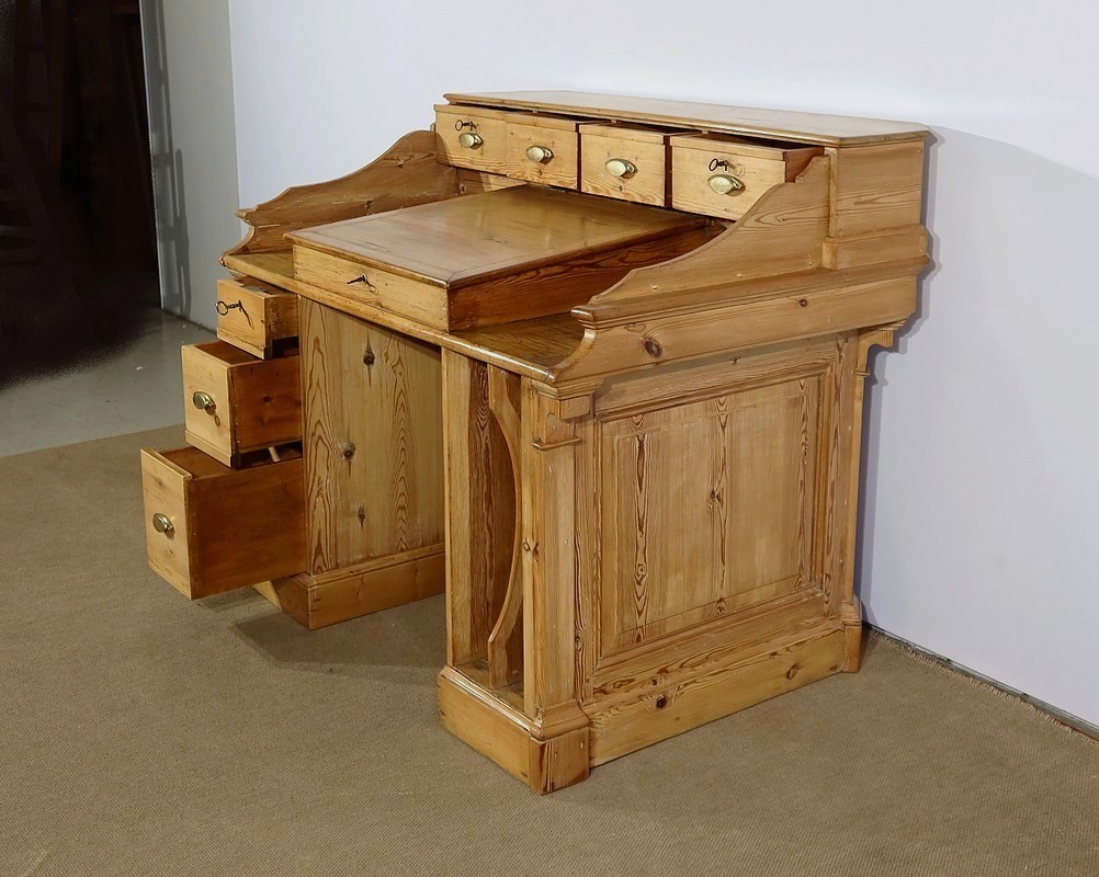 Grand bureau de commerce en pitchpin massif présentant une face « client » composée d’un large panneau horizontal à plate-bande et gorge, entouré d’une moulure en demi-rond et à coupe d’onglet. Les montants sont à pans coupés et les côtés sont également à plate-bande et mouluration autour reposant sur une plinthe dont le dessus est à gorge.