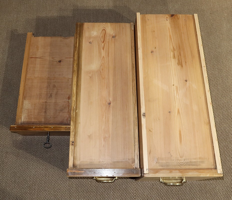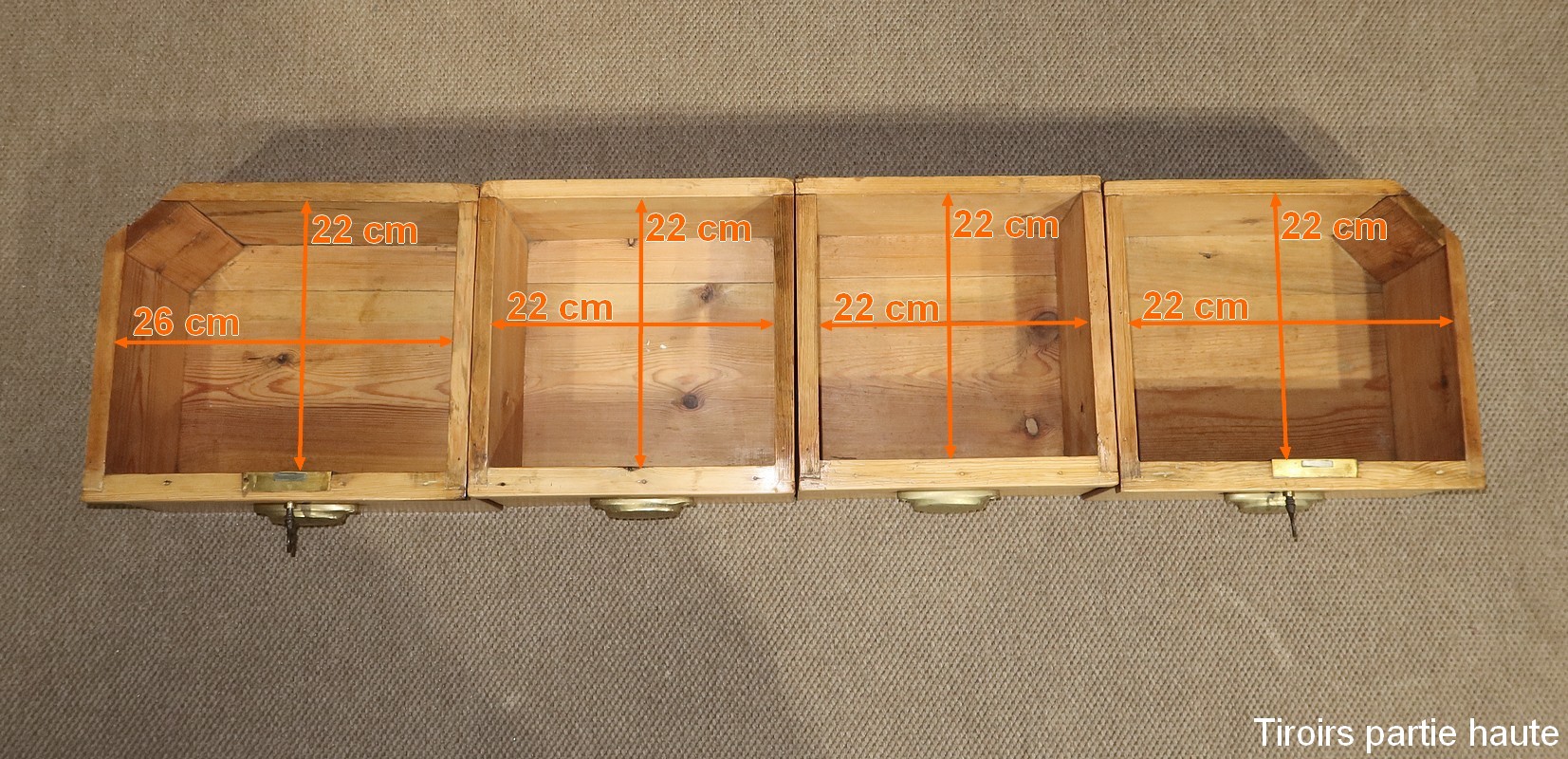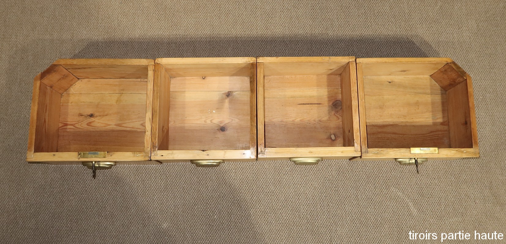 Celui-ci est composé de quatre tiroirs en partie supérieure dont l’ouverture se fait par poignée coquille en laiton. Deux de ces tiroirs ferment à clé.