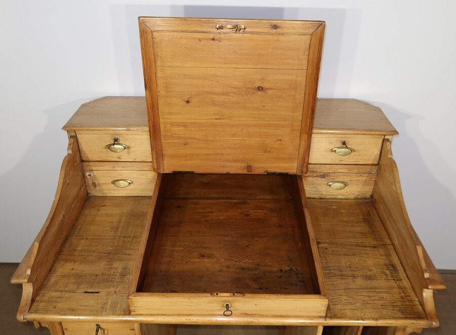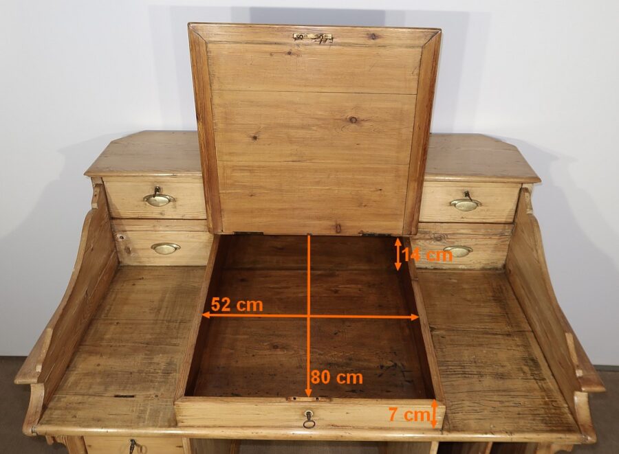 Le dessus de ce meuble est composé d’un élément central ou pupitre, s’ouvrant avec clé et serrure d’origine à 2 crochets en état de fonctionnement.