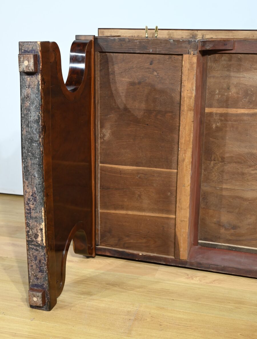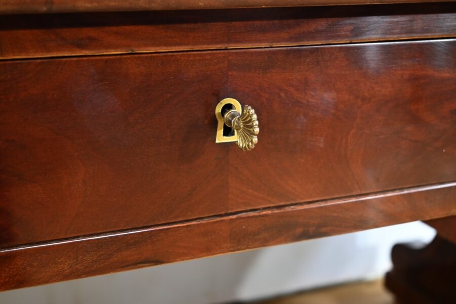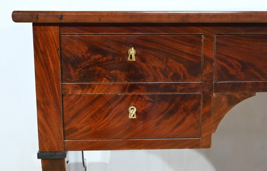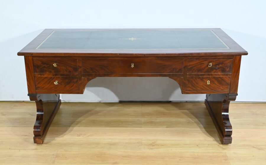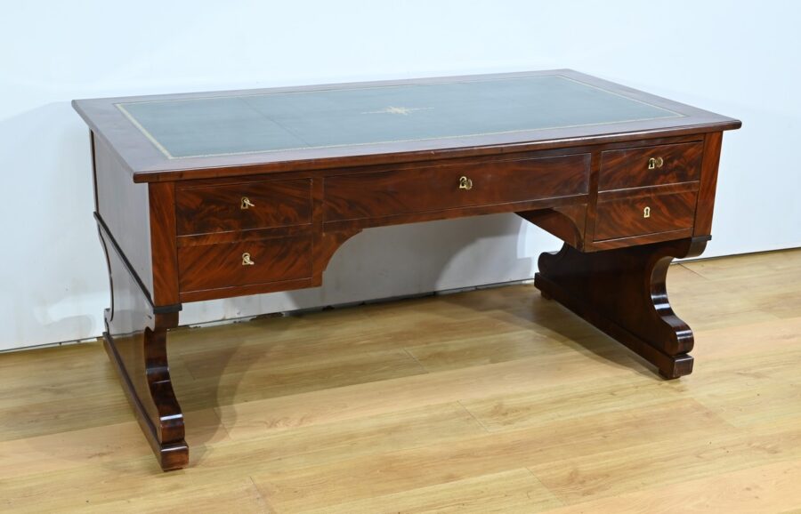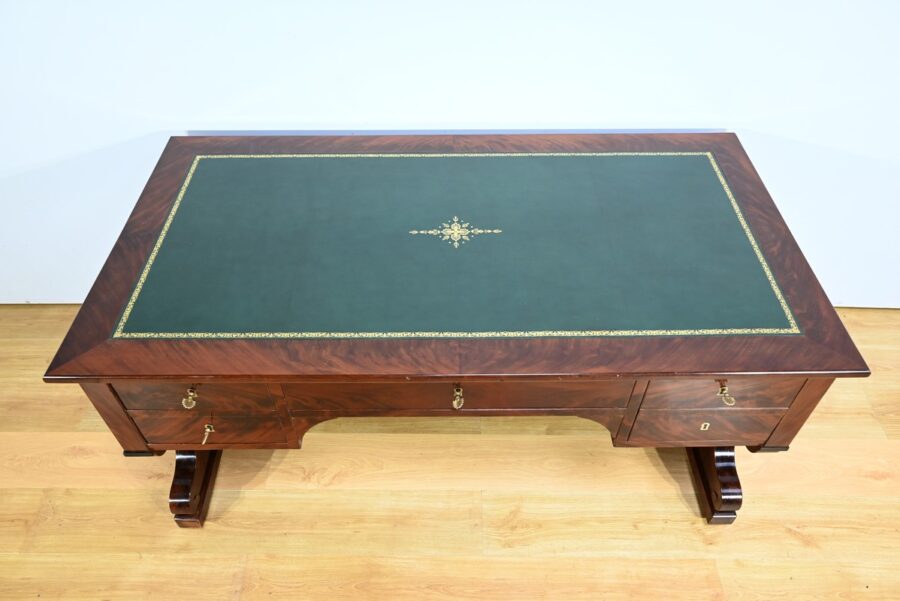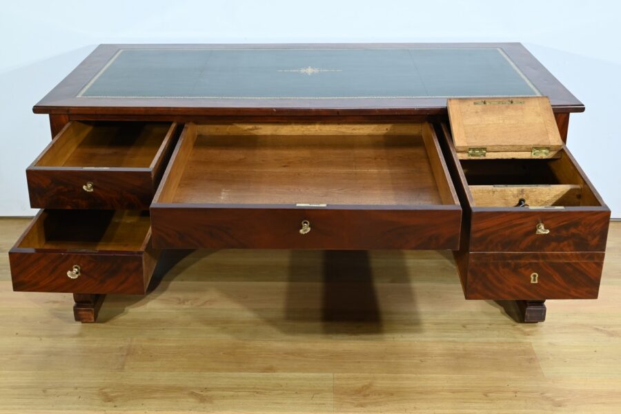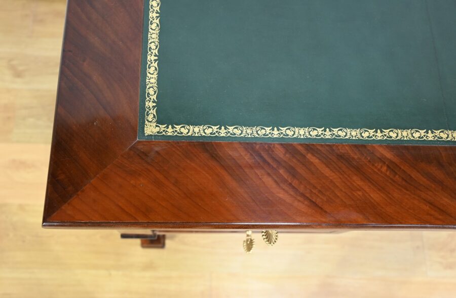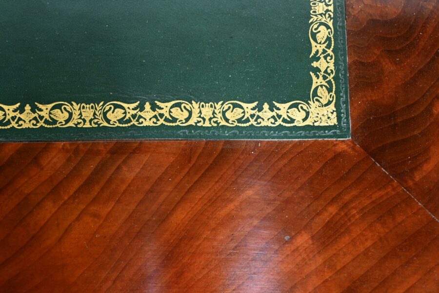 Le dessus à cadre à coupe d’onglet, en ramage de ronce d’acajou, est habillé d’un cuir vert avec motif central, vignette dorée et vignettes à froid dans l’alignement des tiroirs.