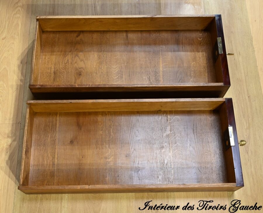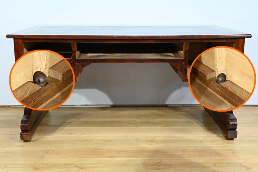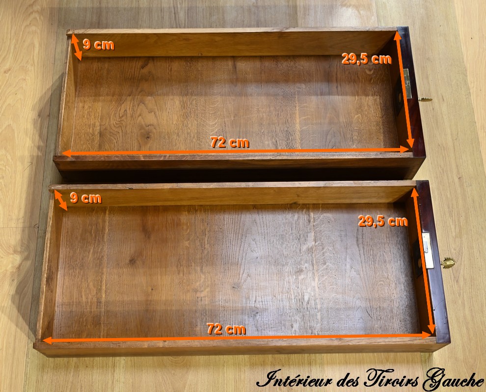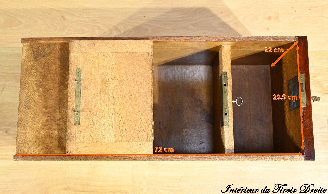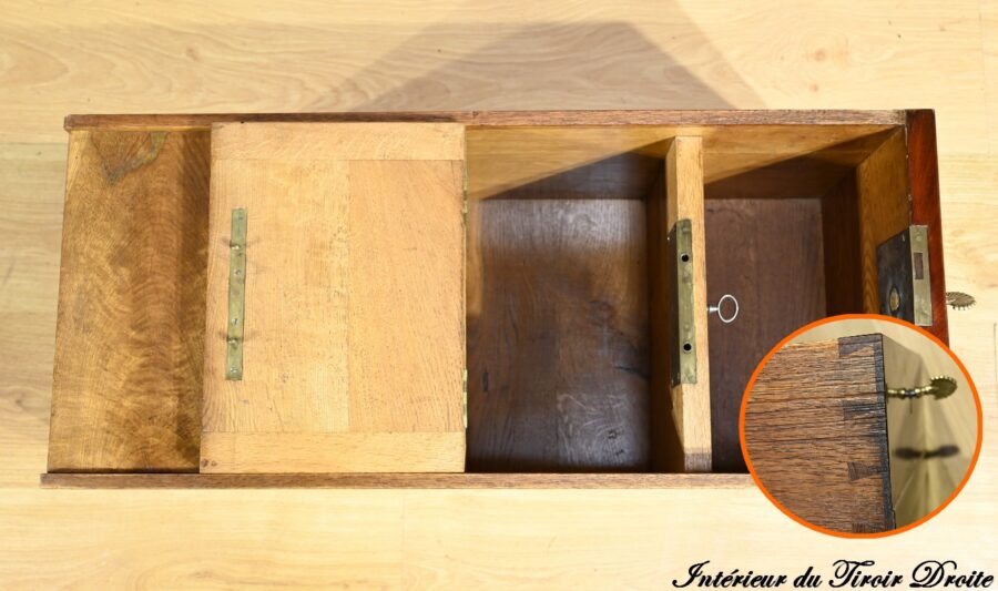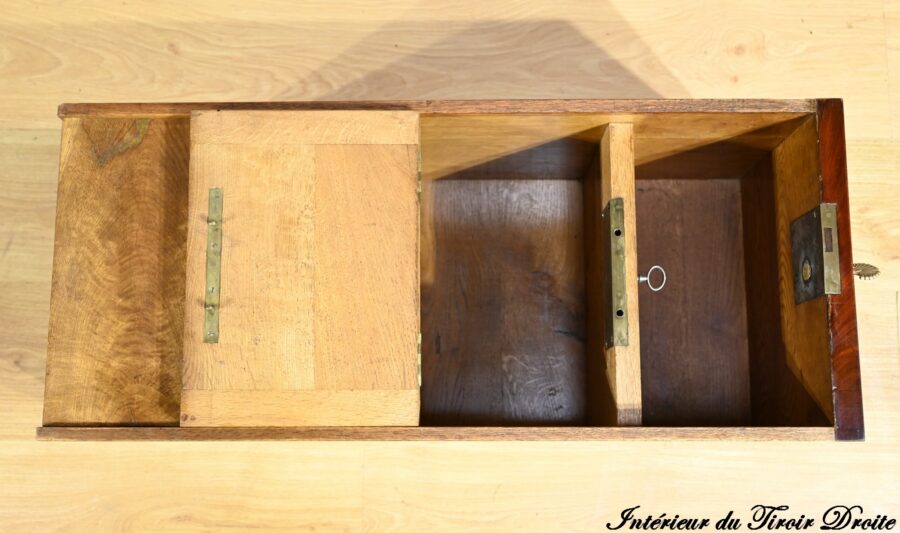 Le tiroir de droite comprend deux niches et un compartiment spacieux à abatant, monté sur charnières, avec serrure authentique à deux points.