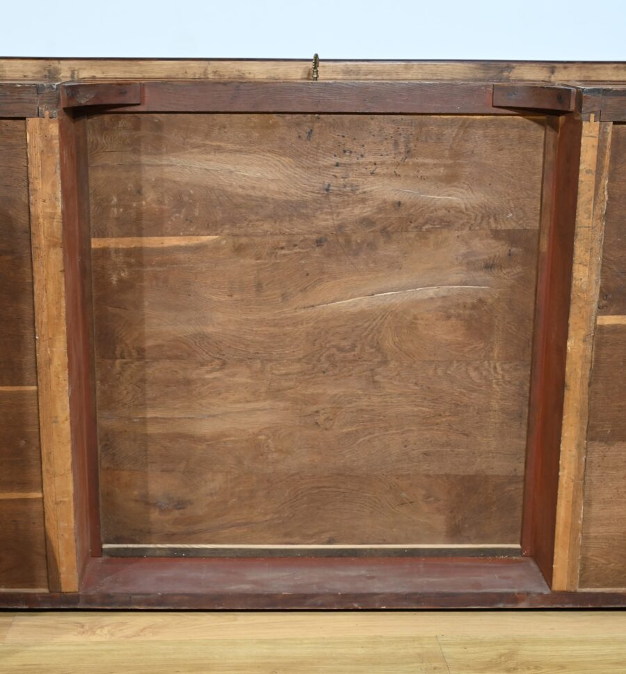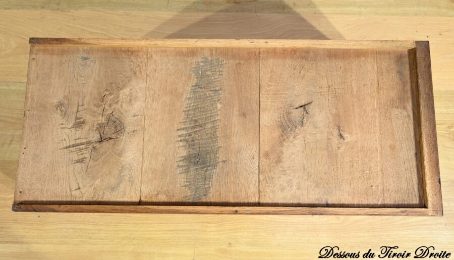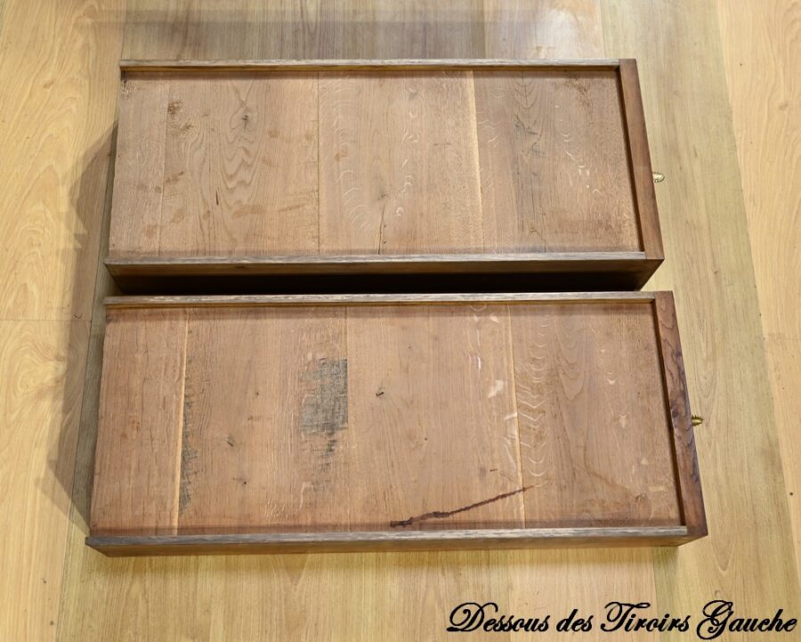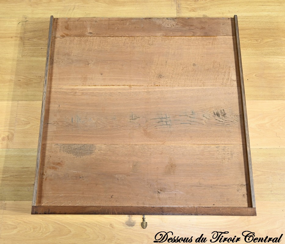 Celui-ci ouvre en partie gauche par deux tiroirs identiques, au centre par un tiroir peu profond et en partie droite par un tiroir simulant deux façades.