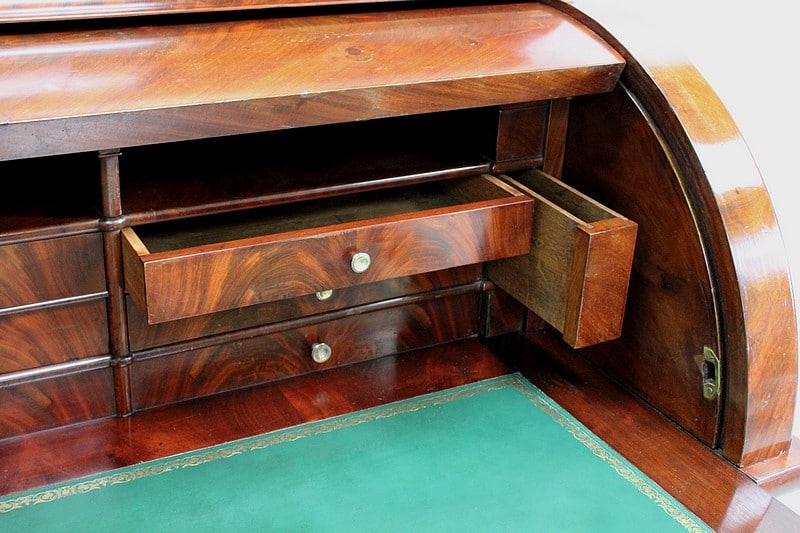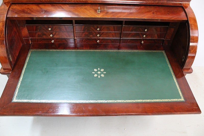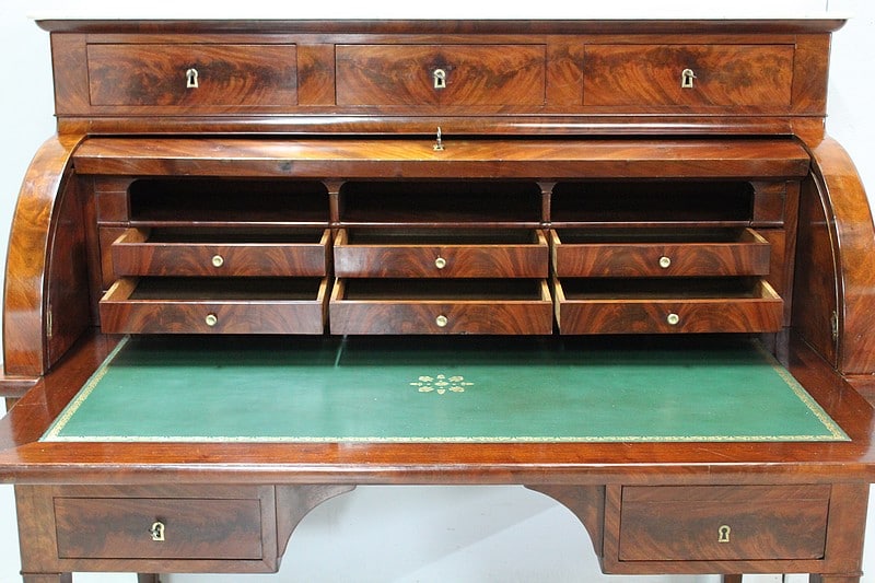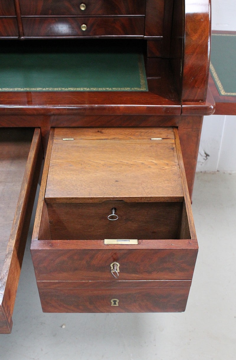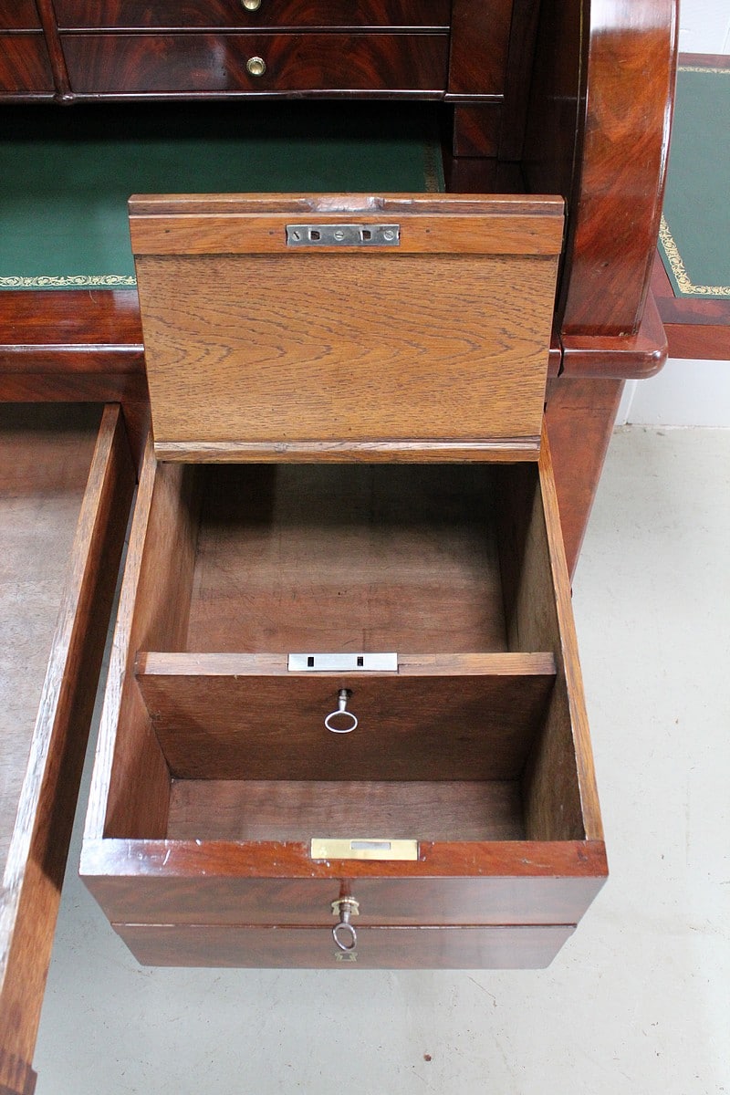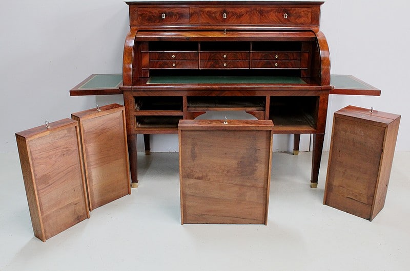 Il ouvre en gradin par 3 tiroirs fermant à clefs et montés à queues d’aronde, puis en dessous par le cylindre. Celui-ci donnant sur un intérieur composé de 3 niches en partie haute, 6 tiroirs en dessous puis d’un plateau rétractable avec 3 autres tiroirs simulés, en décors. 1 compartiment secret est disposé de chaque côtés des tiroirs, actionnés par un mécanisme à l’ouverture du tiroir du haut. Les intérieurs et fonds de tiroirs sont tous en chêne et toutes les serrures sont d’origine. Le plateau est recouvert d’un cuir de vachette vert refait avec vignettes et motif central dorés.
