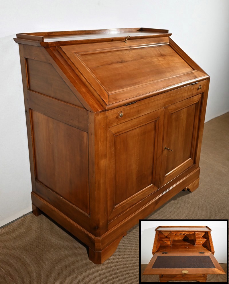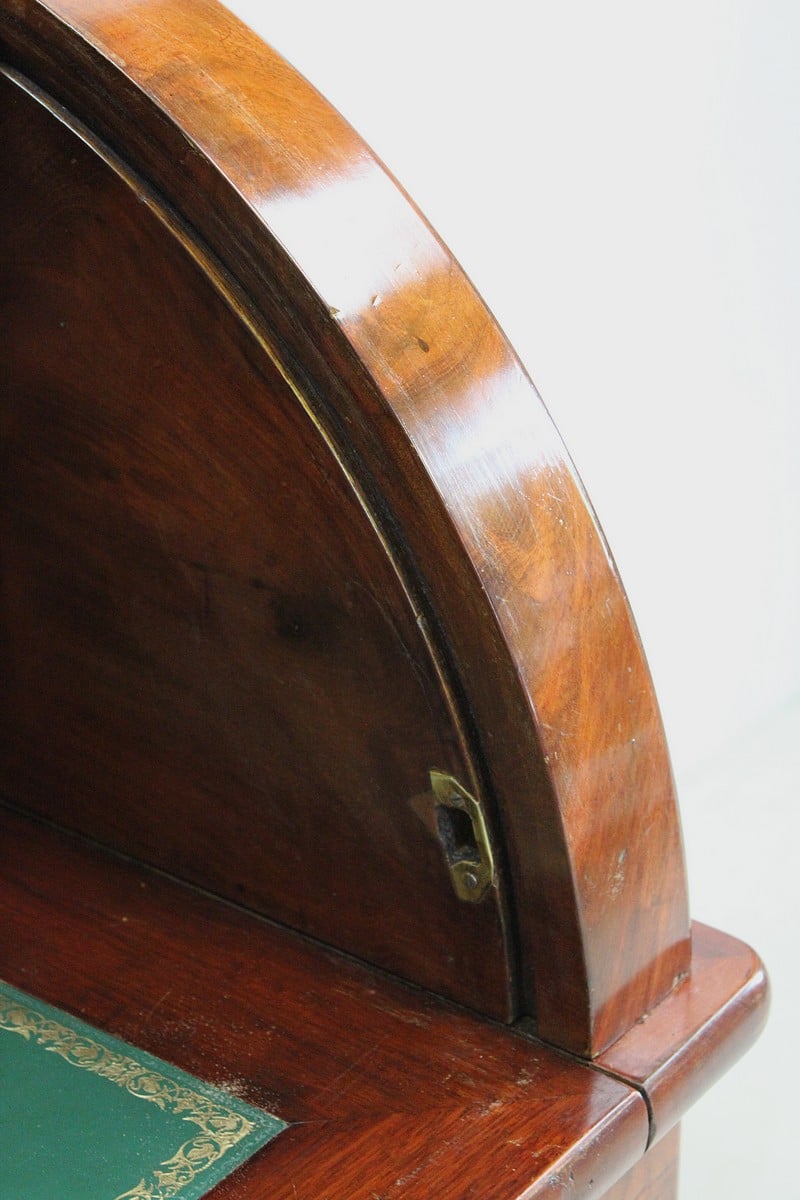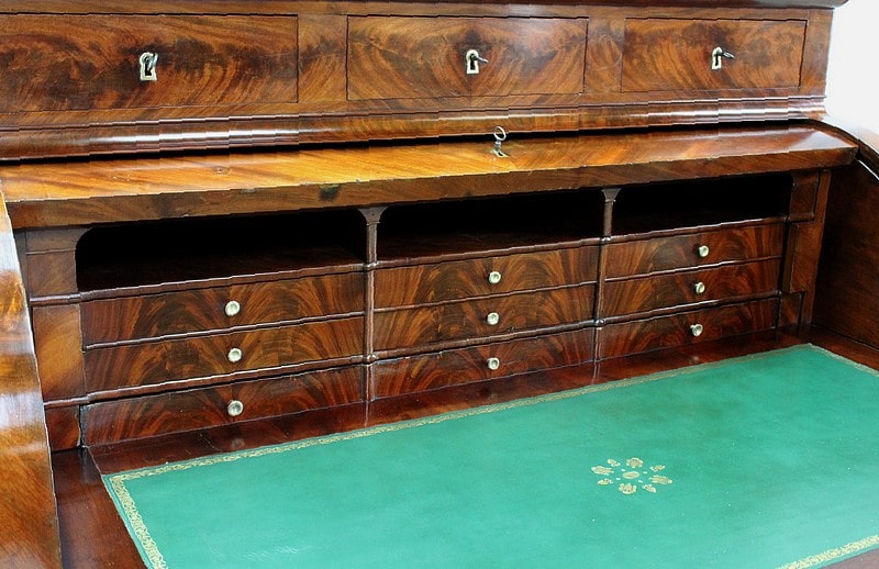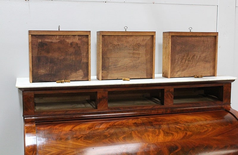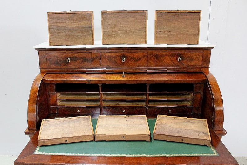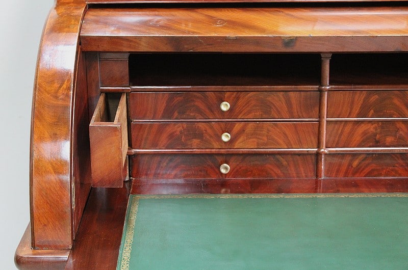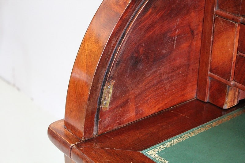 Il ouvre en gradin par 3 tiroirs fermant à clefs et montés à queues d’aronde, puis en dessous par le cylindre. Celui-ci donnant sur un intérieur composé de 3 niches en partie haute, 6 tiroirs en dessous puis d’un plateau rétractable avec 3 autres tiroirs simulés, en décors. 1 compartiment secret est disposé de chaque côtés des tiroirs, actionnés par un mécanisme à l’ouverture du tiroir du haut. Les intérieurs et fonds de tiroirs sont tous en chêne et toutes les serrures sont d’origine. Le plateau est recouvert d’un cuir de vachette vert refait avec vignettes et motif central dorés.