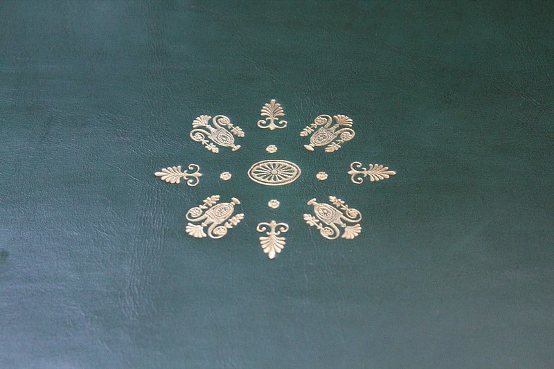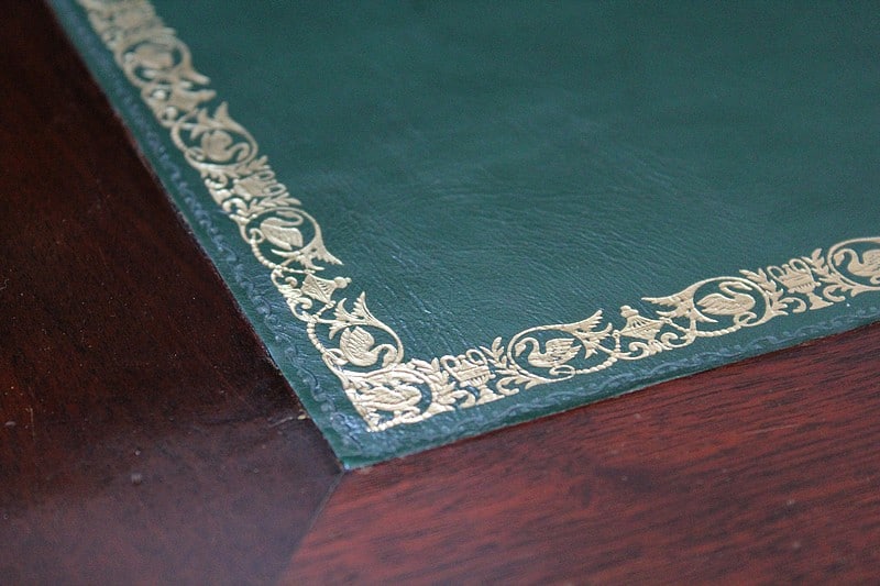 Les côtés sont dotés de tirettes également recouvertes du même cuir vert refait à neuf.