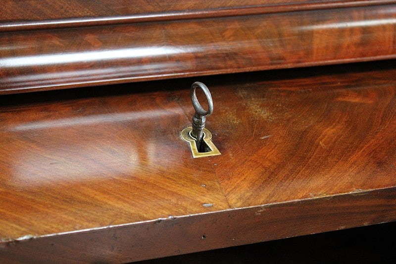 En partie basse, il ouvre par 2 tiroirs à gauche, un tiroir central plus large ainsi que par un tiroir-caisse simulant 2 tiroirs, dont l’intérieur est agrémenté d’un compartiment fermant à clef.