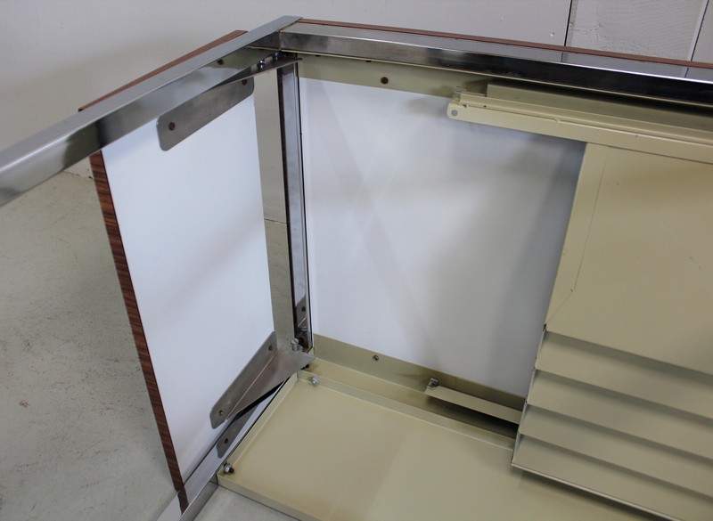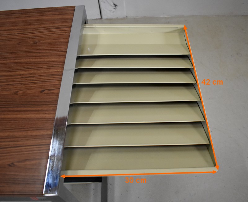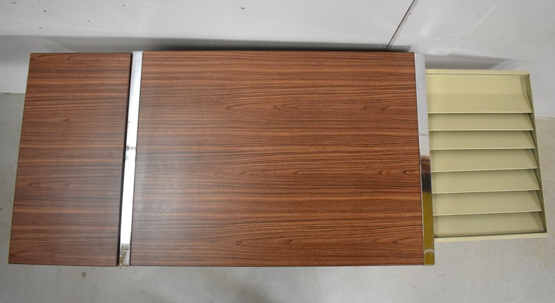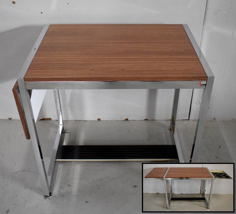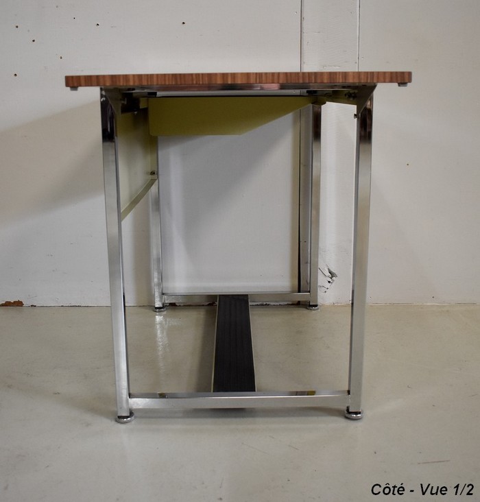 Ce Meuble Vintage au Design résolument Industriel, est doté d’un plateau Rectangulaire en Formica imitation Palissandre. A gauche, un volet latéral du même revêtement permet d’agrandir le Bureau. Cette allonge peut être rabattue pour économiser de l’espace.